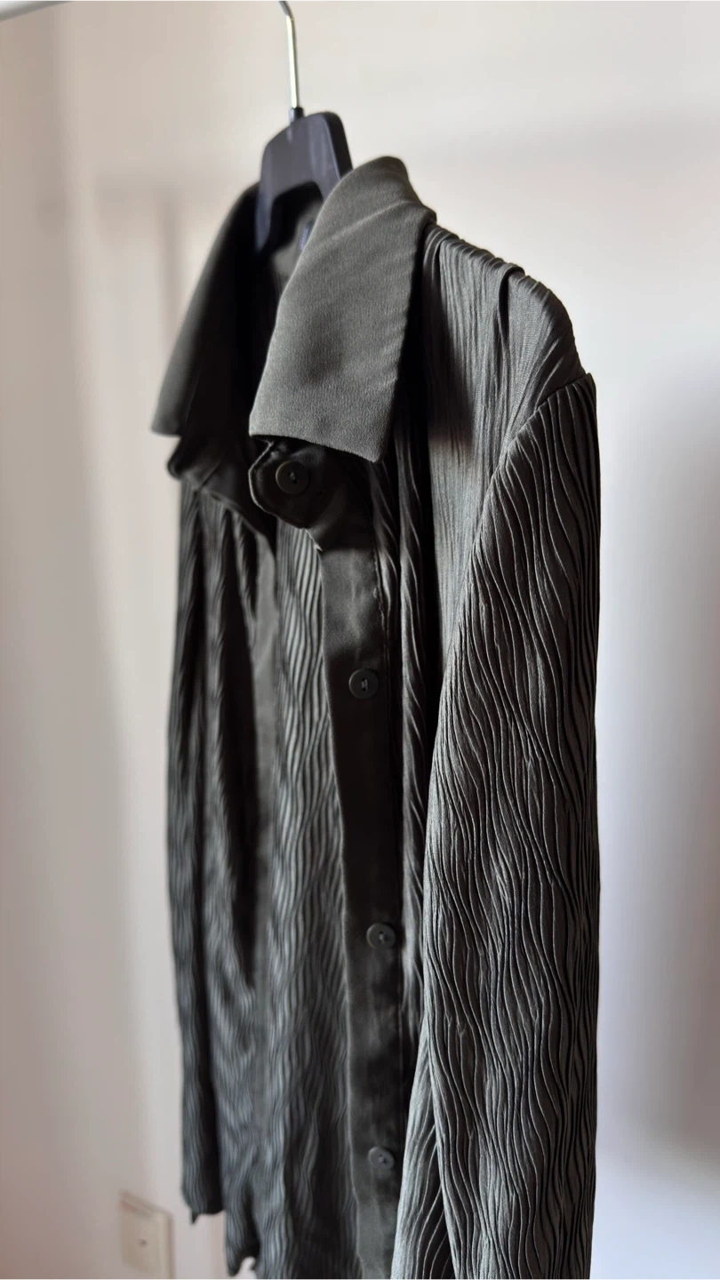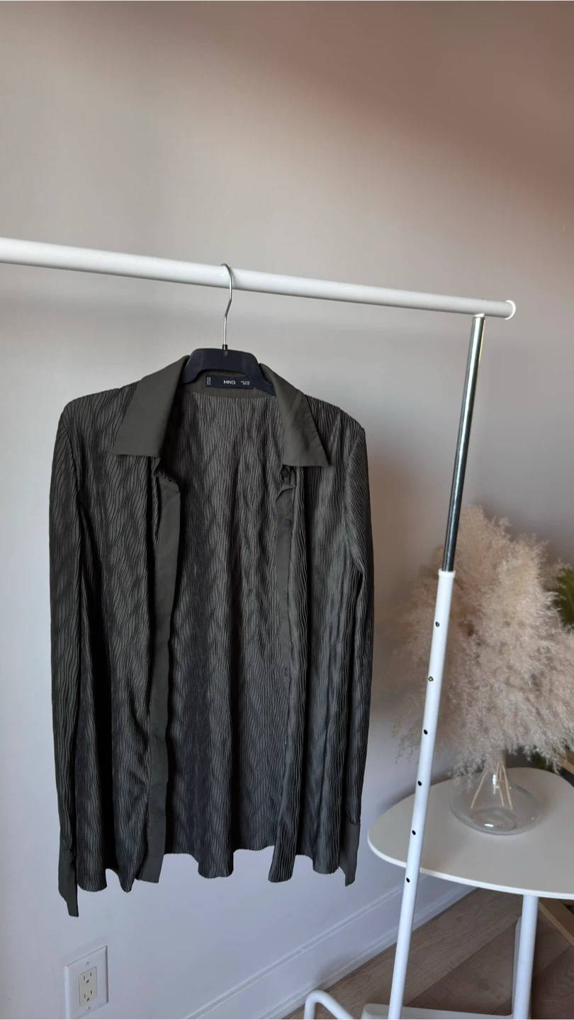 MNG dark green long-sleeve shirt with a unique textured fabric and a knotted front detail. It features a classic collar and button-up closure. Made of lightweight material.