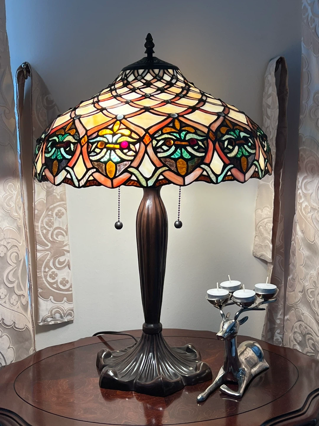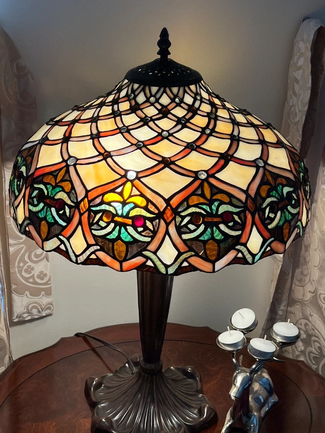Beautiful and elegant vintage Tiffany-style table lamp, in perfect condition with no cracks, no chips, and no damage at all. The stained glass shade features a stunning floral pattern with warm amber, green, and red tones that create a cozy and classic ambiance when lit.