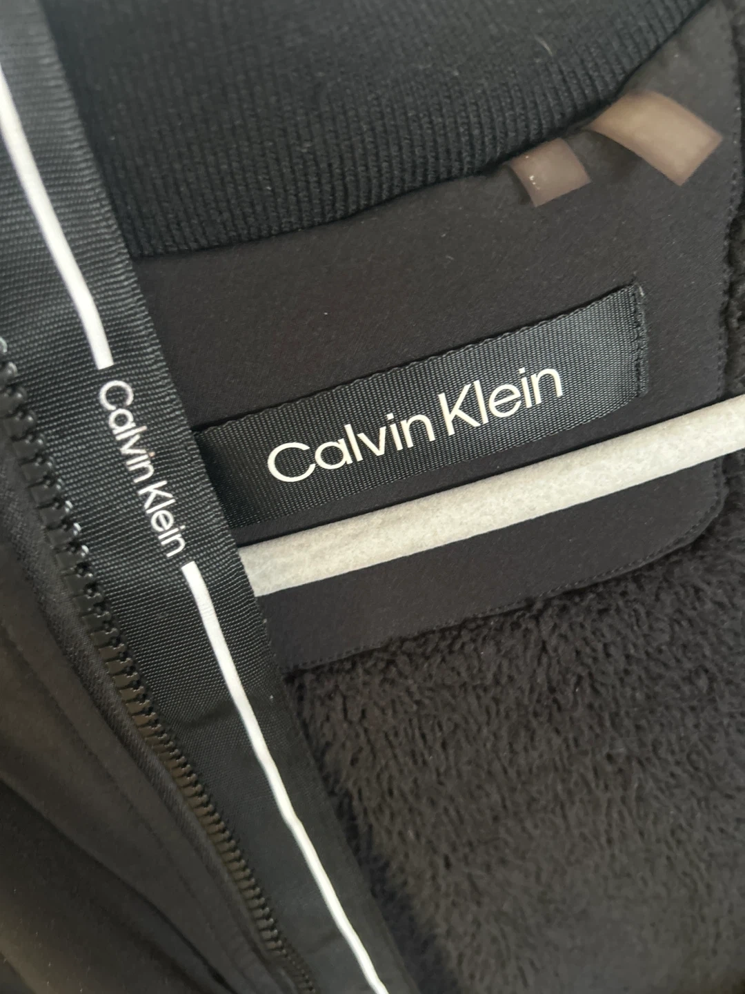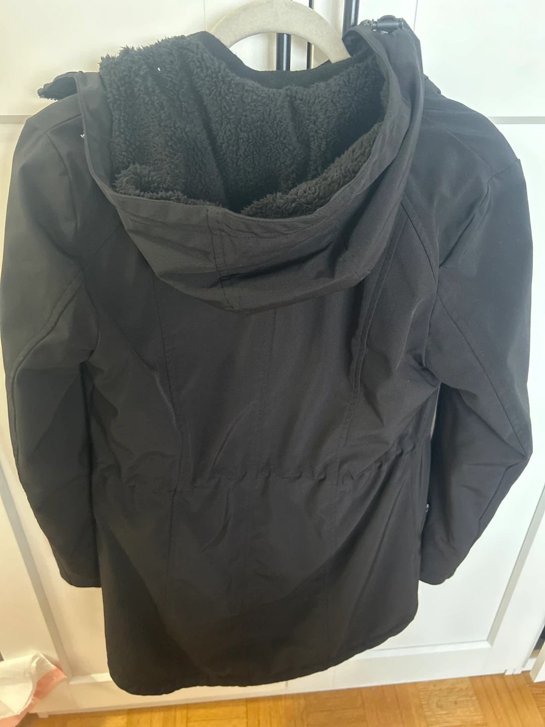 This Calvin Klein parka is black and features a cozy fleece lining for warmth. It has a drawstring waist for a customizable fit. It's a great jacket for chilly weather!