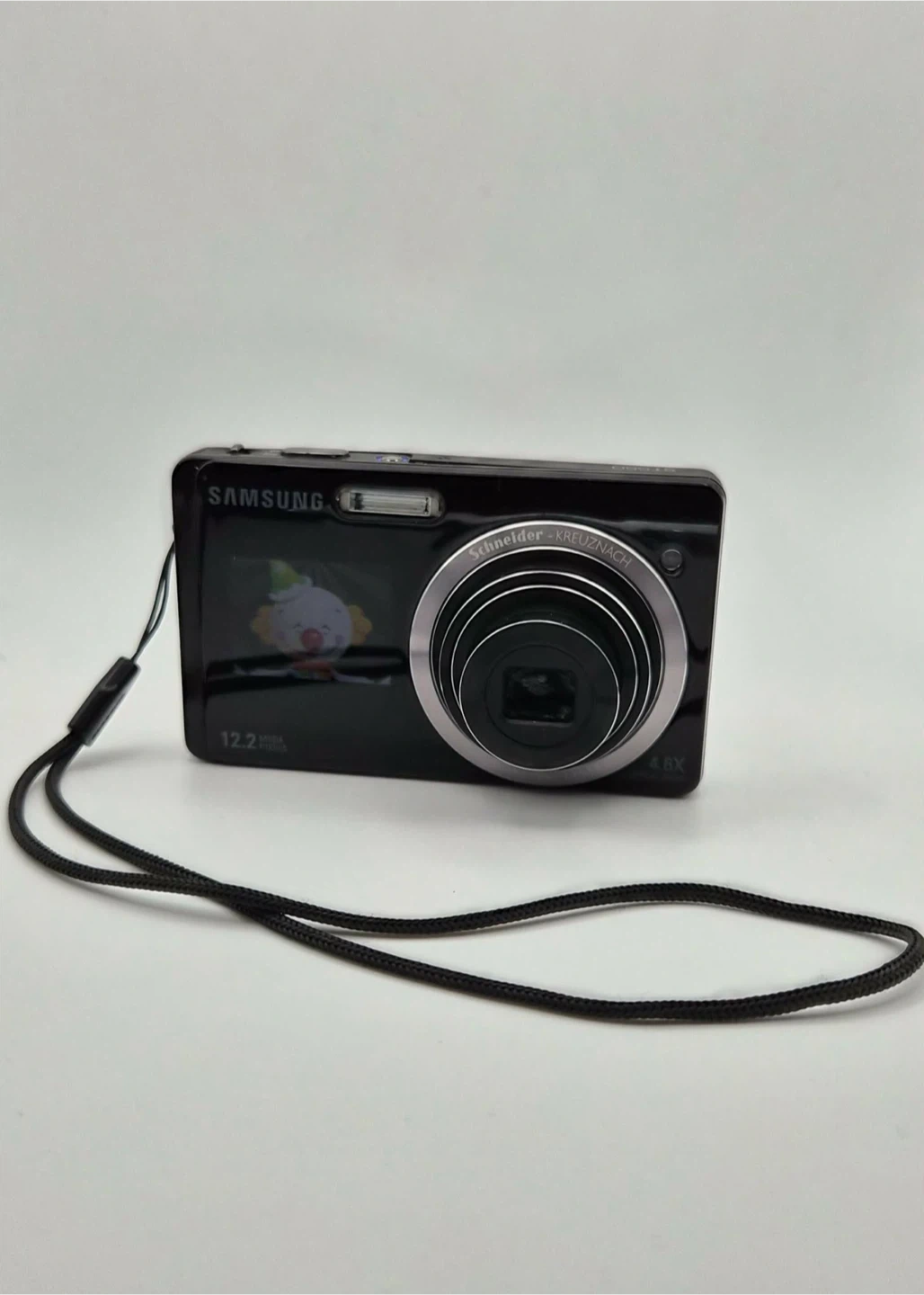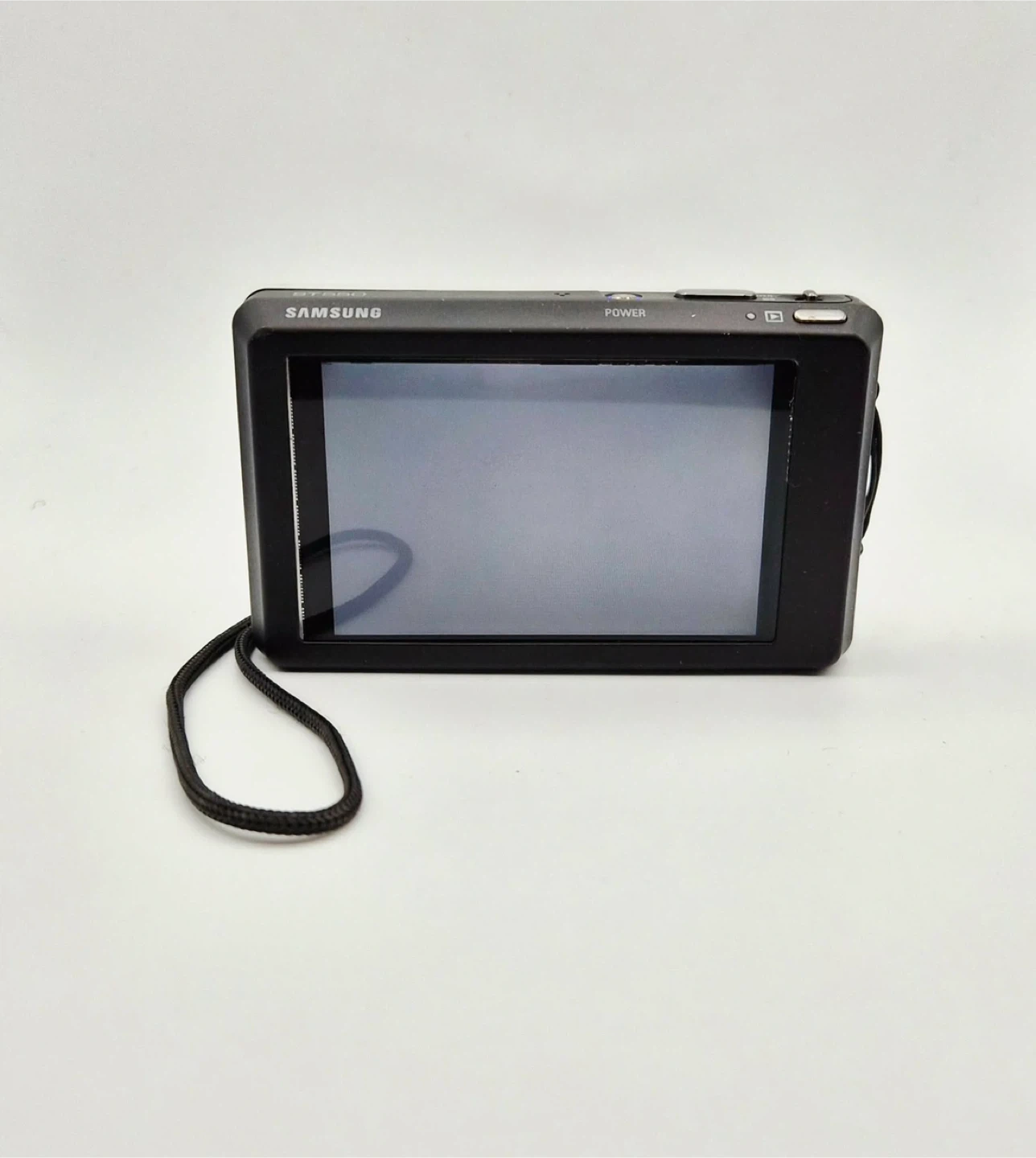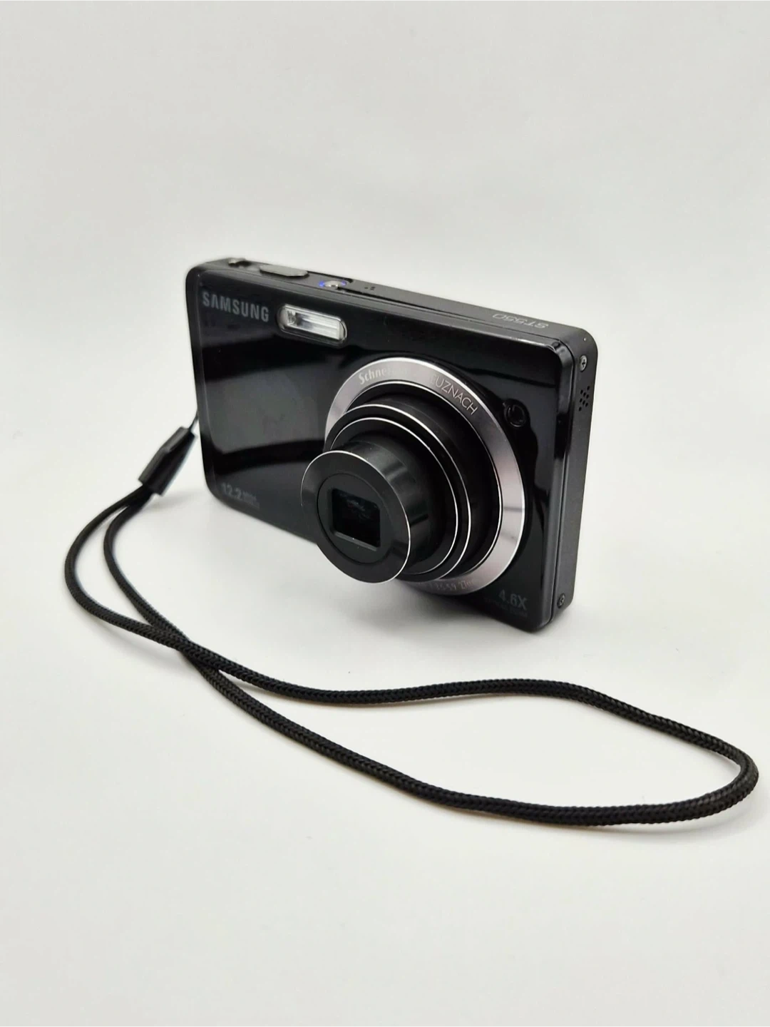 This is a black Samsung ST550 digital camera with a 12.2 megapixel resolution. It features a Schneider-KREUZNACH lens with 4.6X optical zoom. It has a large LCD screen on the back. Included: 4gb SD card, charger and case.