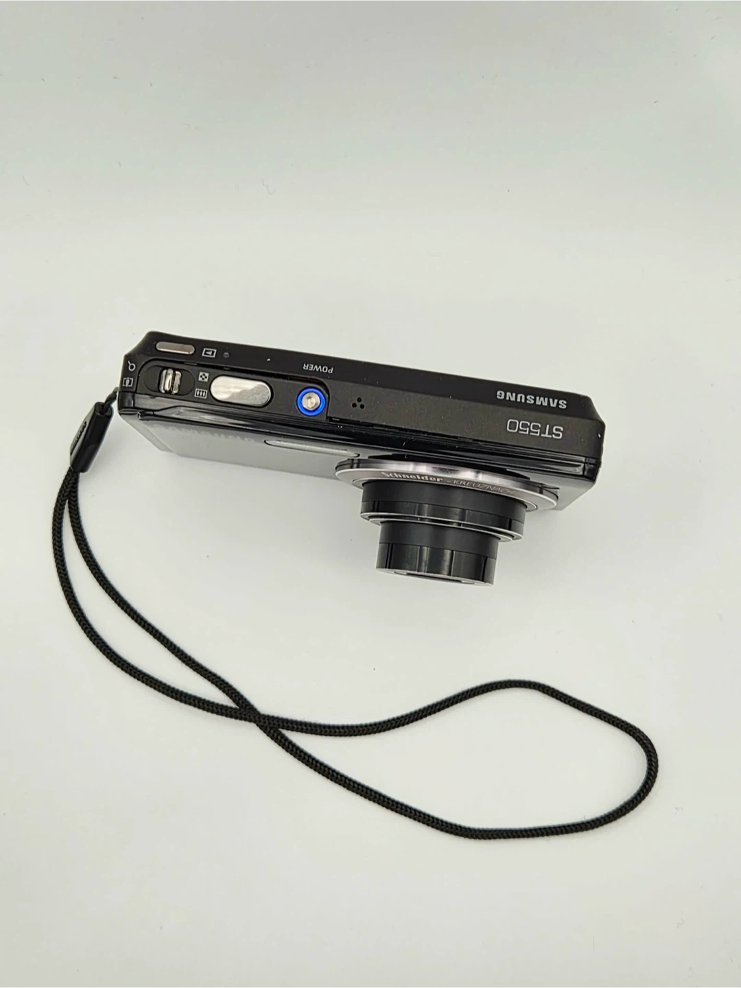 This is a black Samsung ST550 digital camera with a 12.2 megapixel resolution. It features a Schneider-KREUZNACH lens with 4.6X optical zoom. It has a large LCD screen on the back. Included: 4gb SD card, charger and case.