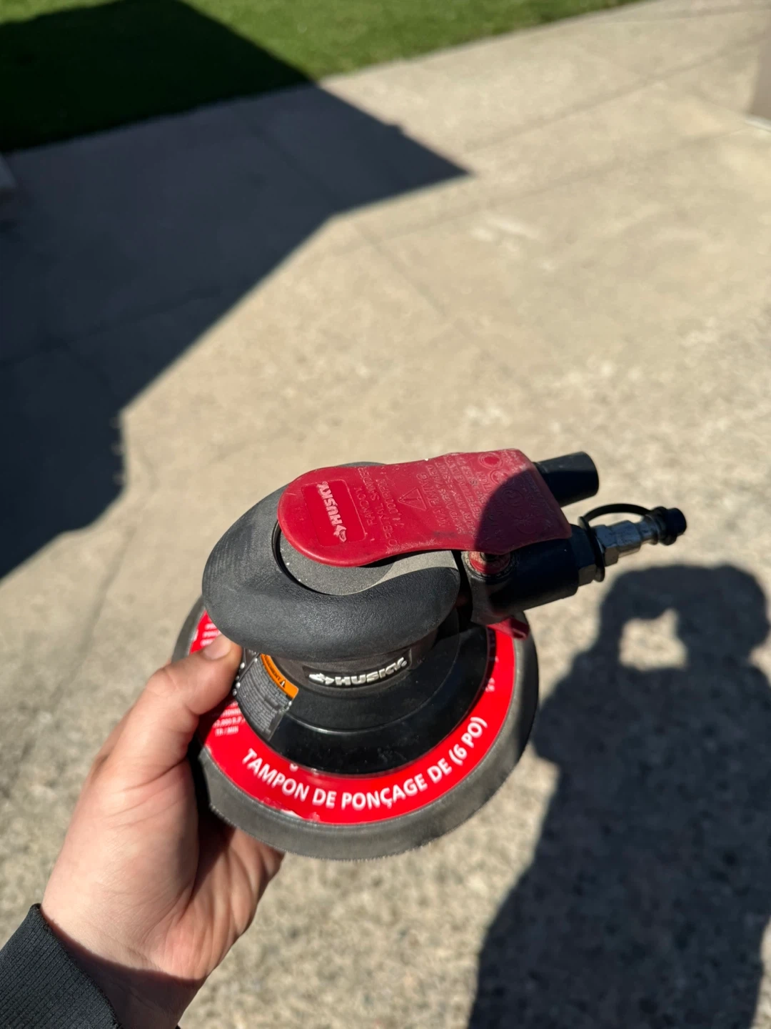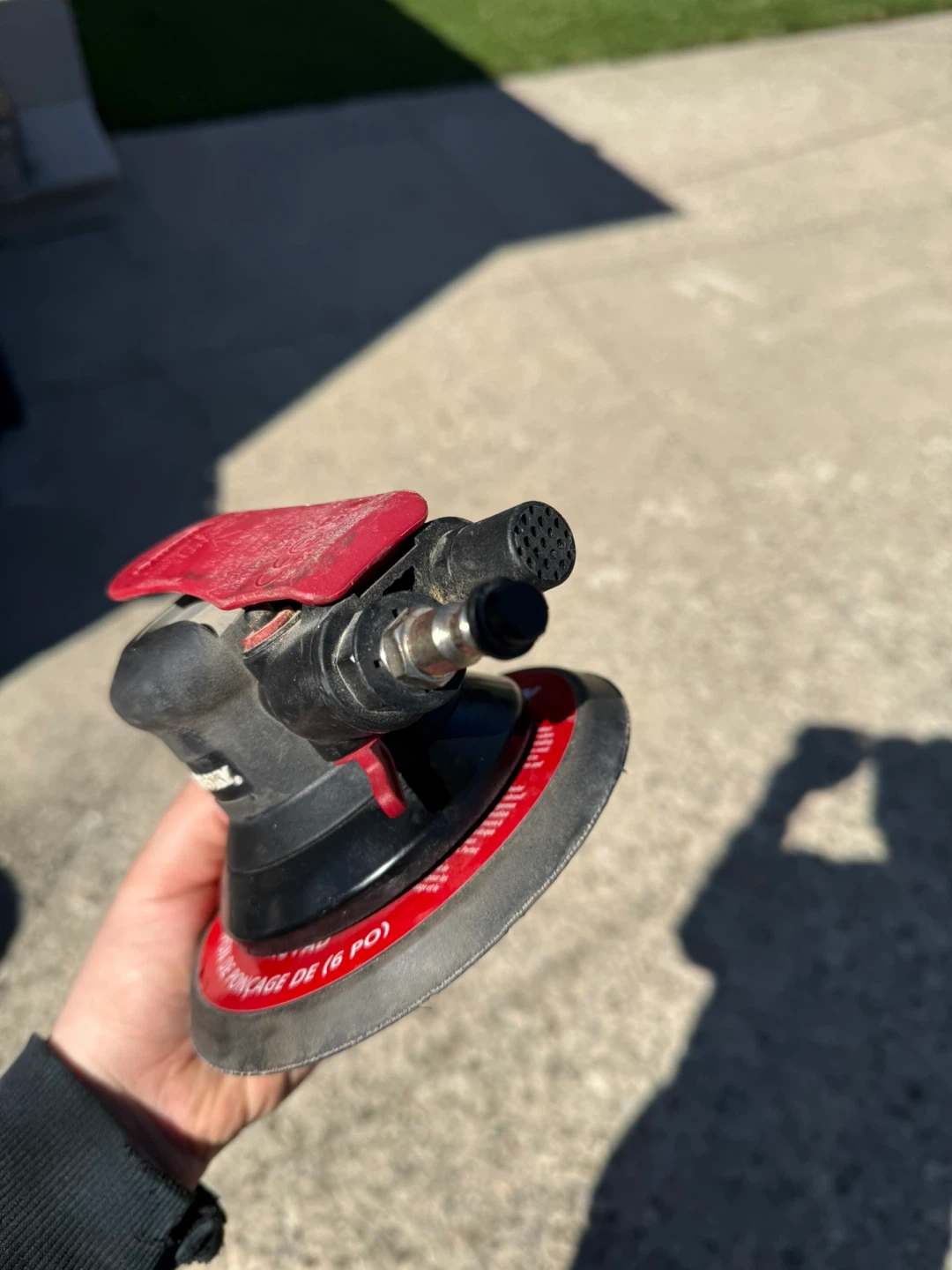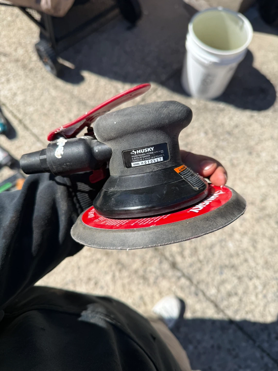 This is a Husky pneumatic random orbit sander. It's a 5-inch model with a 3/16-inch orbit. The tool features a comfortable grip and dual-action sanding for a smooth finish.