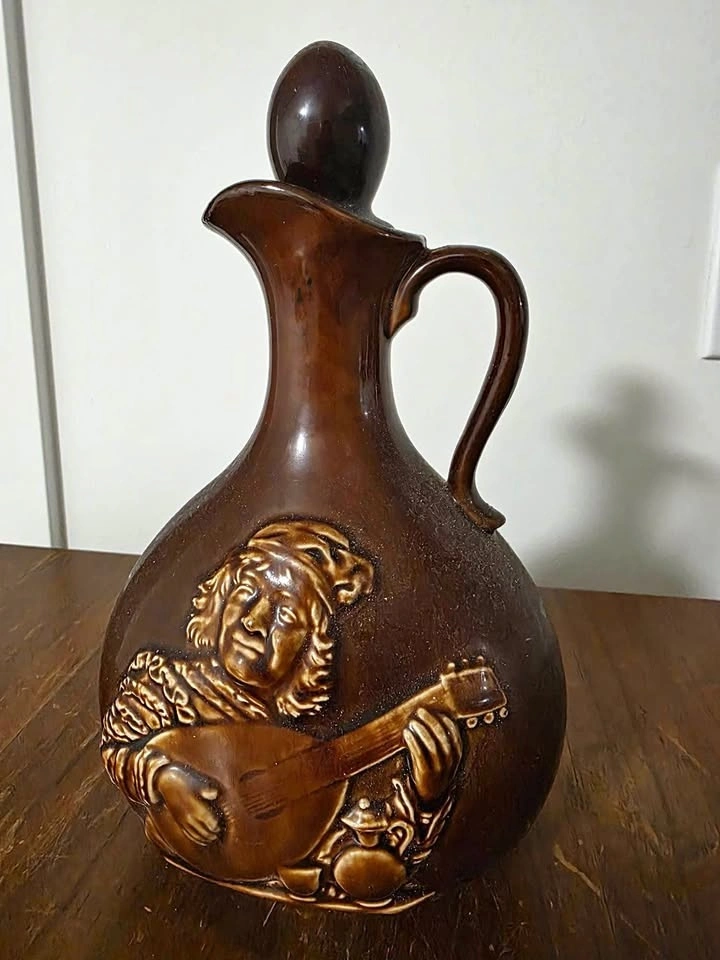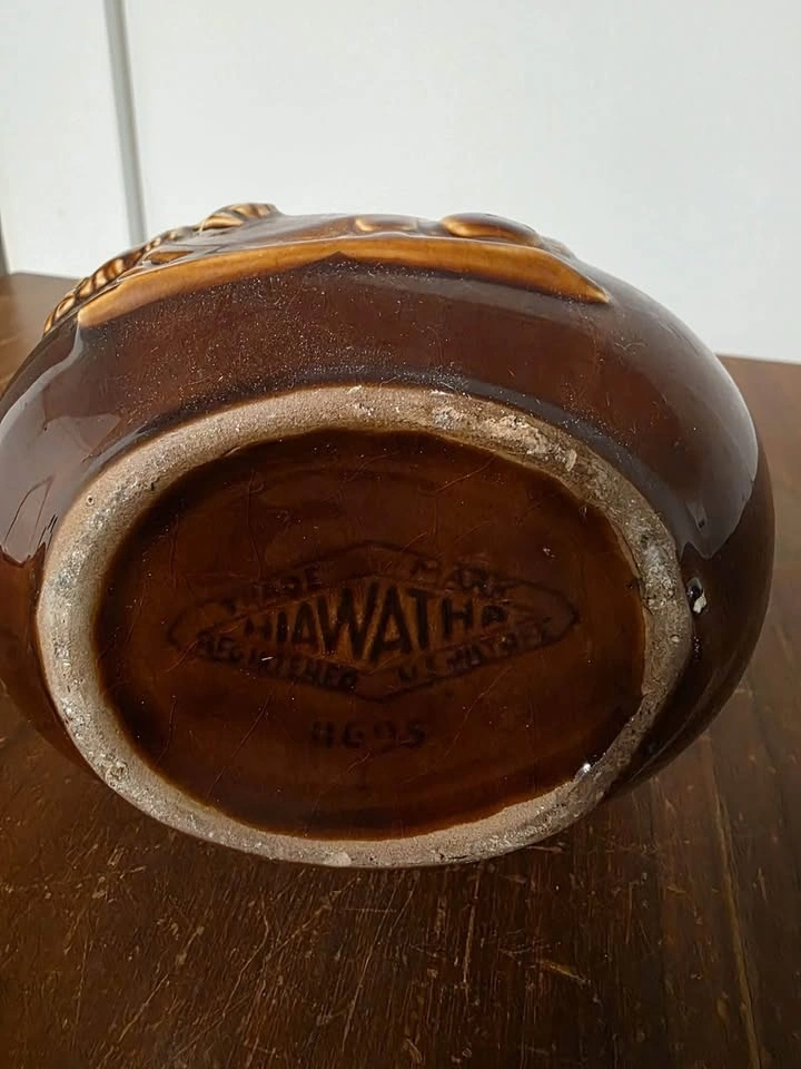 Vintage Hiawatha ceramic decanter in a rich brown glaze. Features a detailed raised design of Hiawatha playing a stringed instrument. This beautiful mid-century style piece is great for vintage bar décor, a cabin, or collector display. Gently used and in very good condition with no cracks or chips visible. Stopper included.