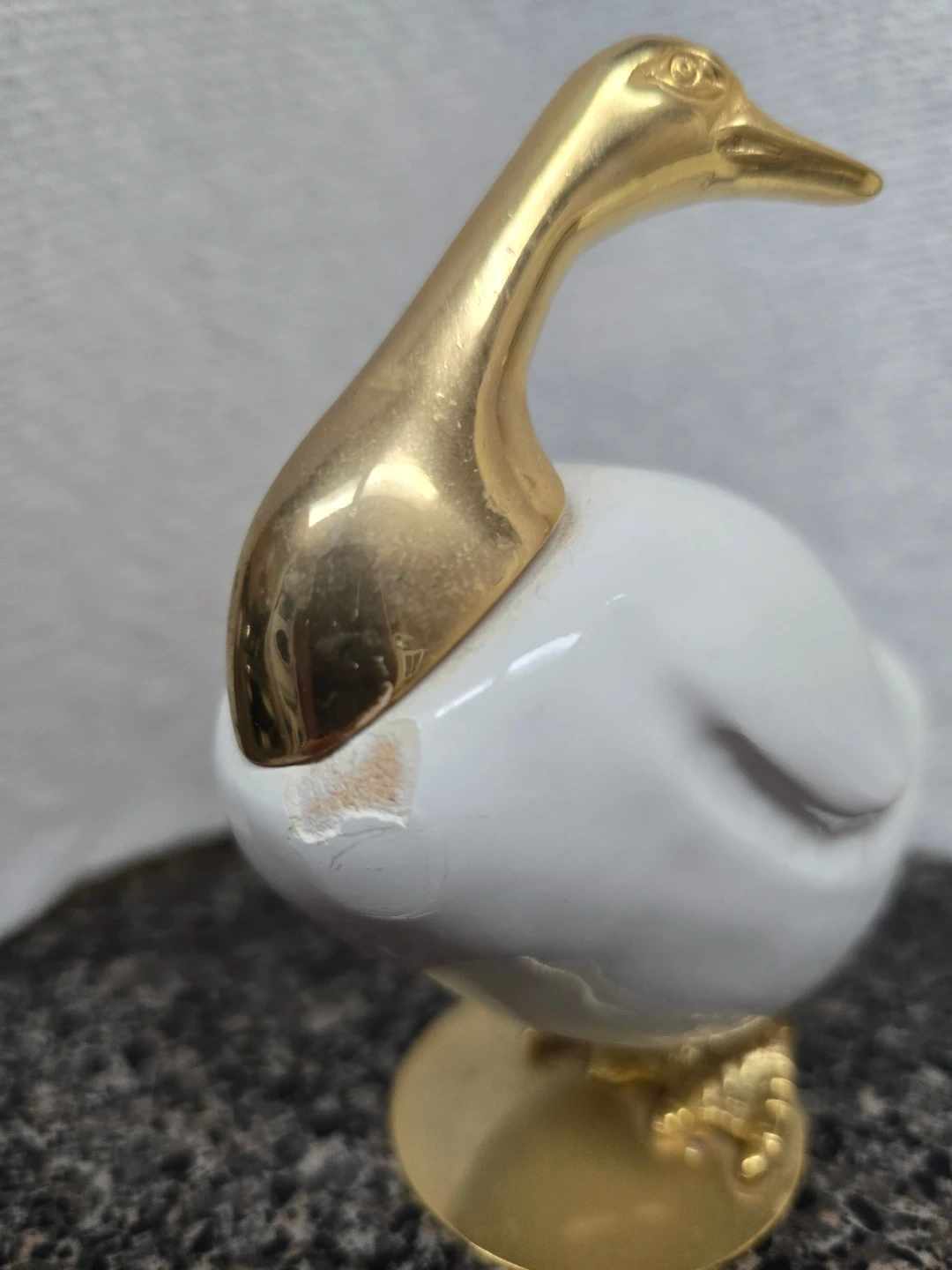 Set of two white ceramic goose figurines with gold accents. These decorative pieces have a glossy finish and stand on gold bases. Some minor chips on the white ceramic are visible, as shown in photos.