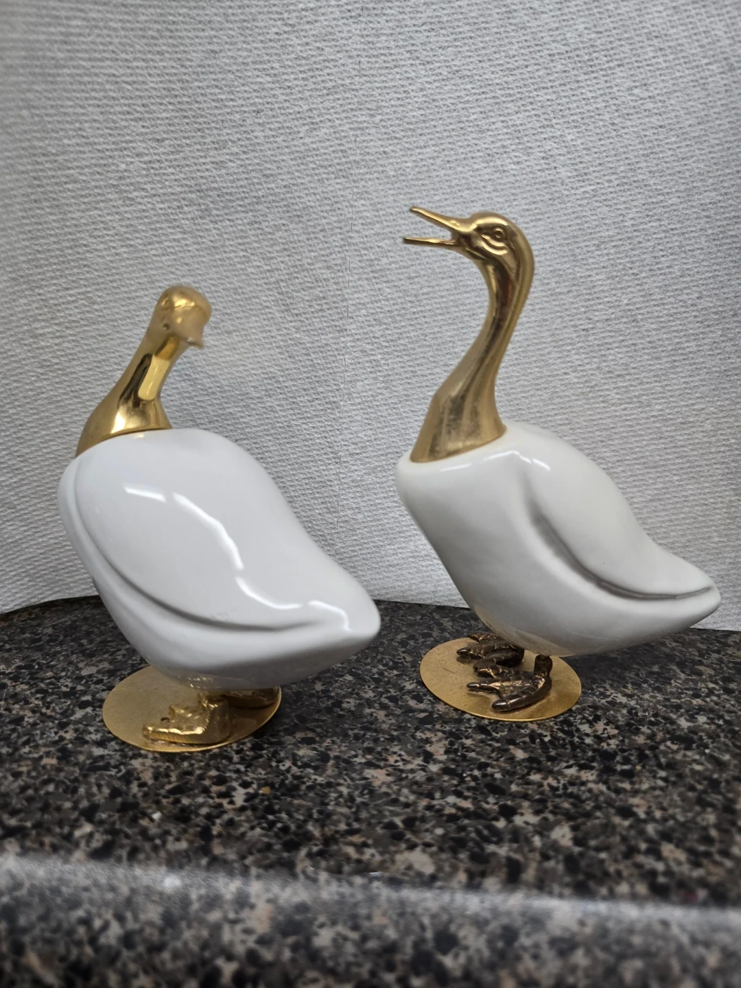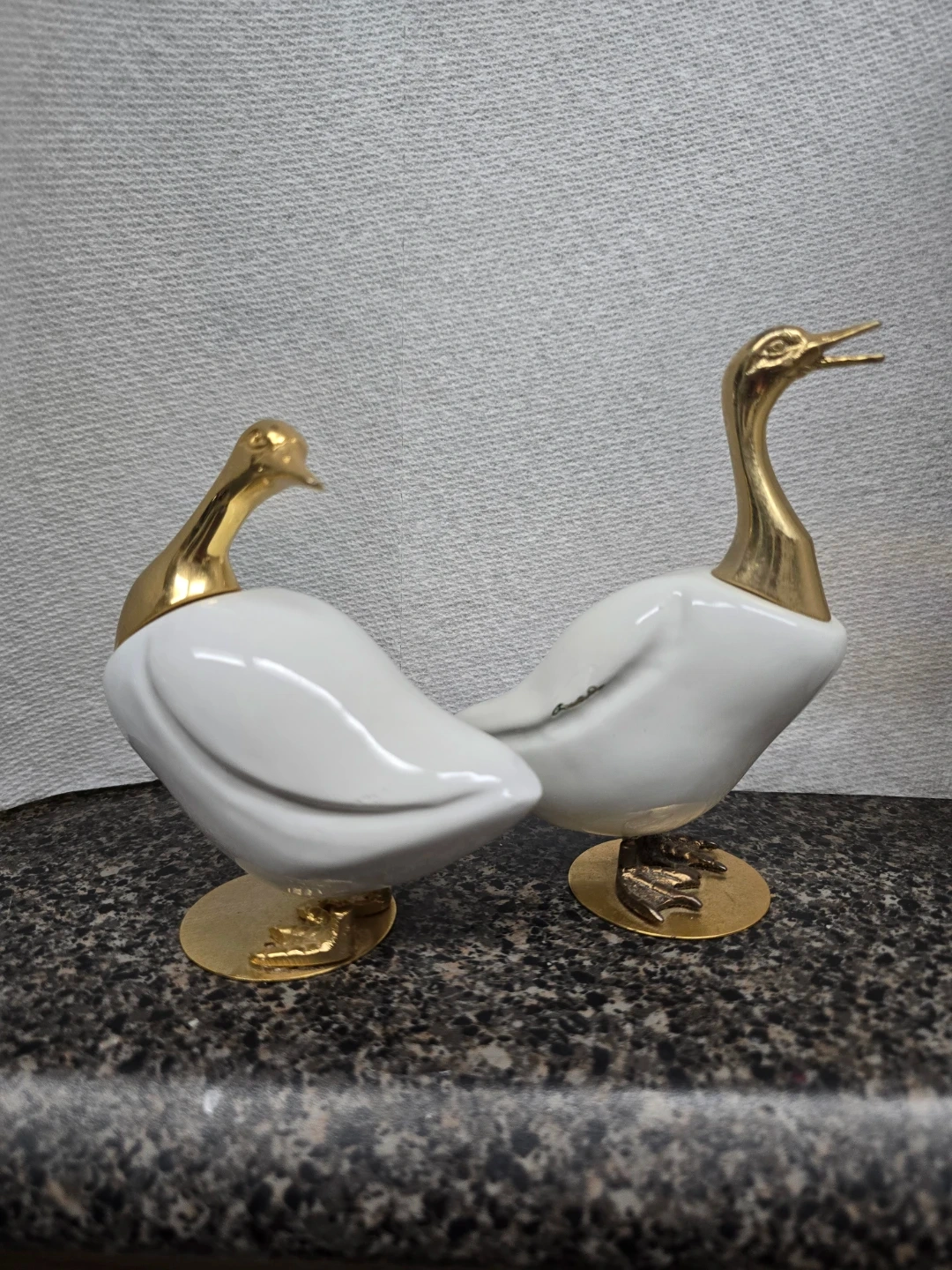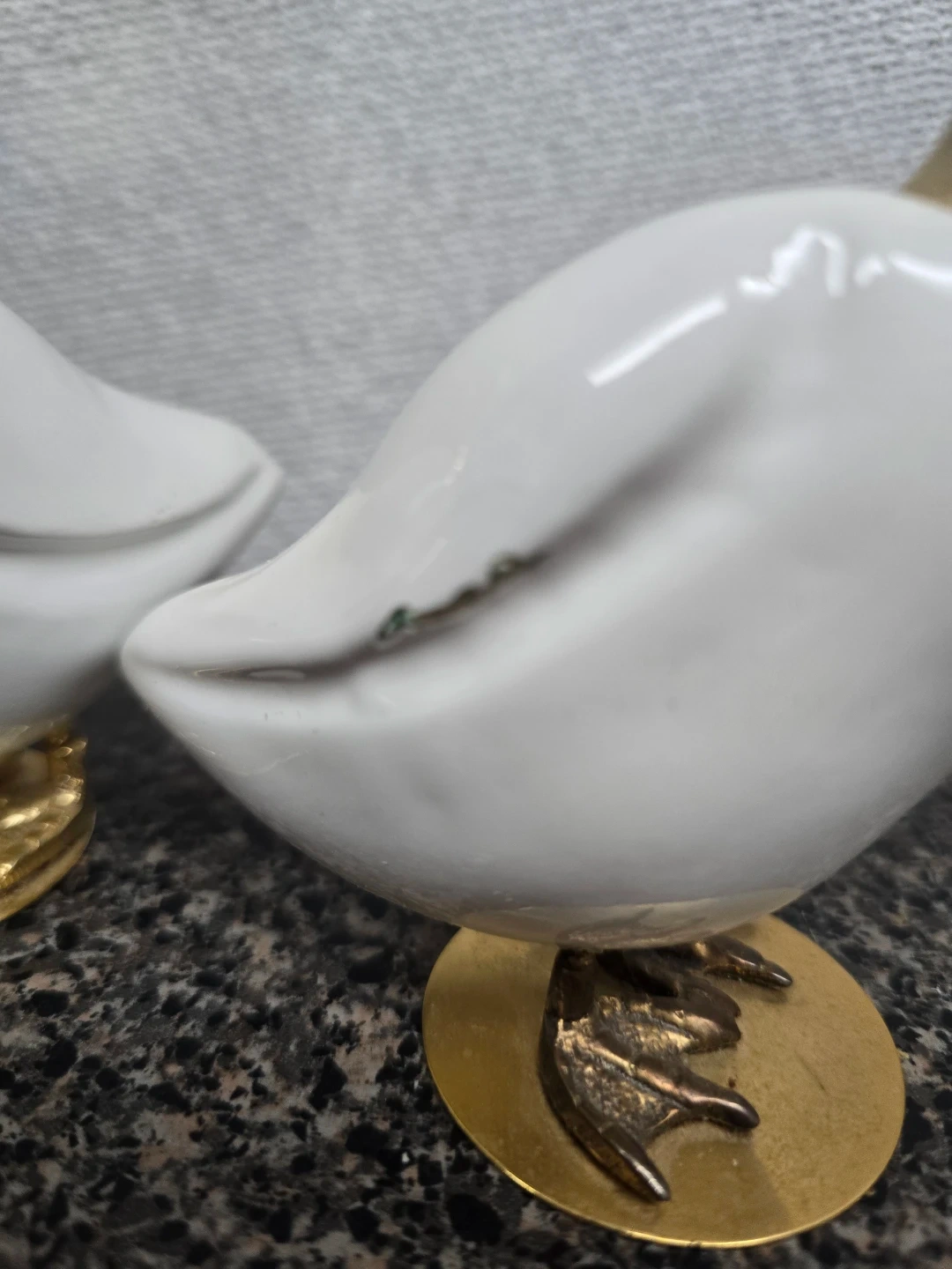 Set of two white ceramic goose figurines with gold accents. These decorative pieces have a glossy finish and stand on gold bases. Some minor chips on the white ceramic are visible, as shown in photos.