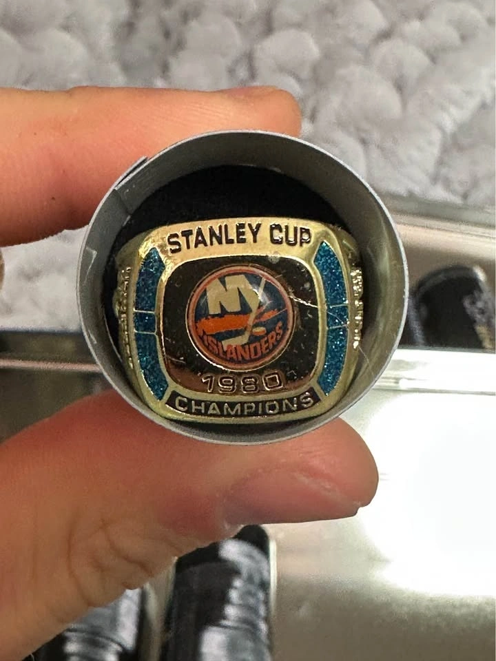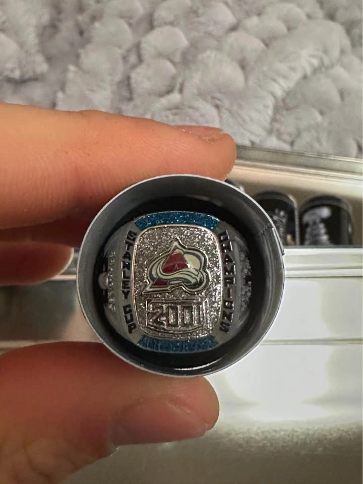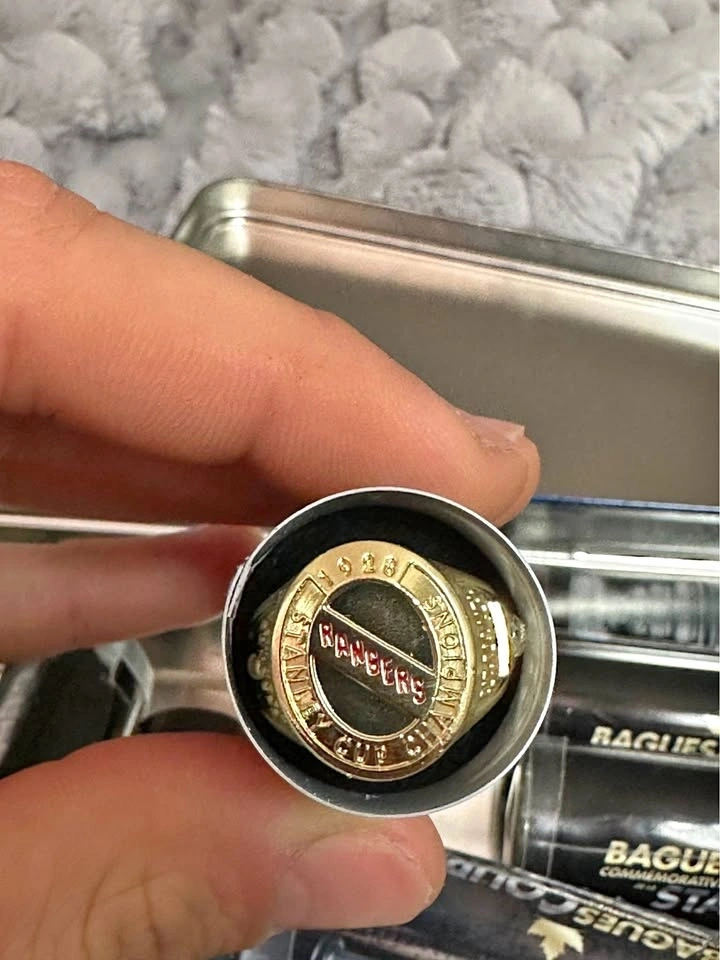 Set of 9 NHL Stanley Cup replica rings. Great for collectors or display. Includes teams like Canadiens, Rangers, Maple Leafs, Bruins, Devils, Avalanche, Islanders & more. Good condition, comes with case. Not real gold – commemorative replicas.