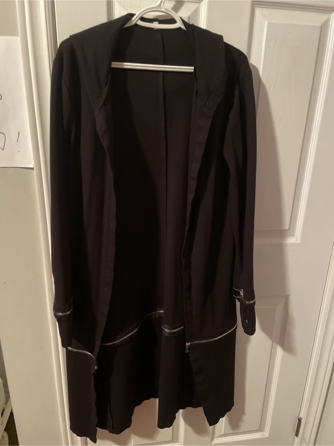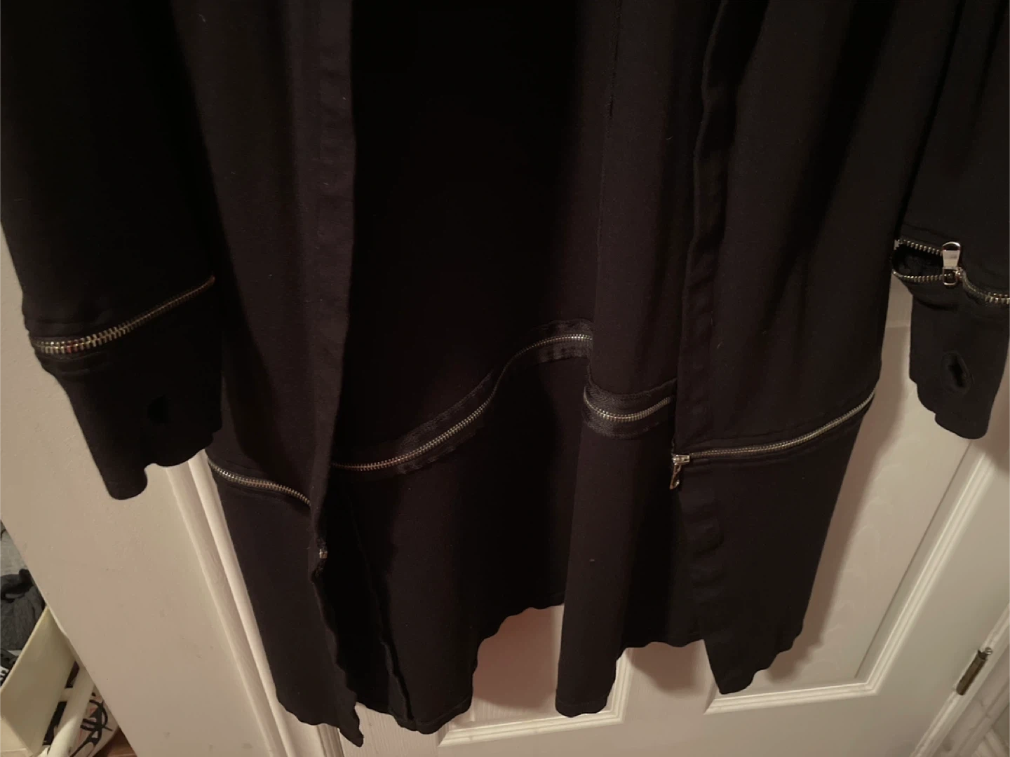 This black open-front cardigan features unique zipper details on the sleeves and hem. It's made from a soft, comfortable fabric. A great layering piece for many outfits!i