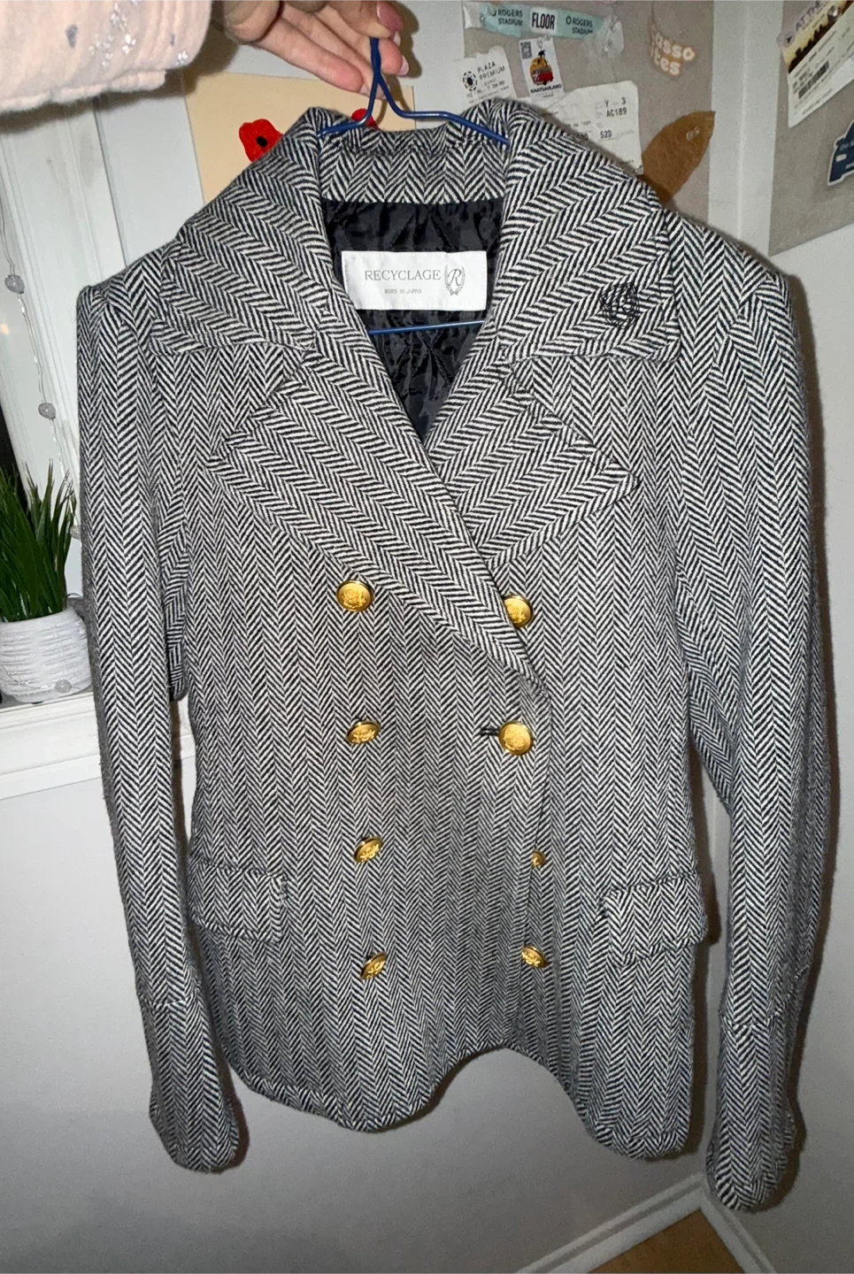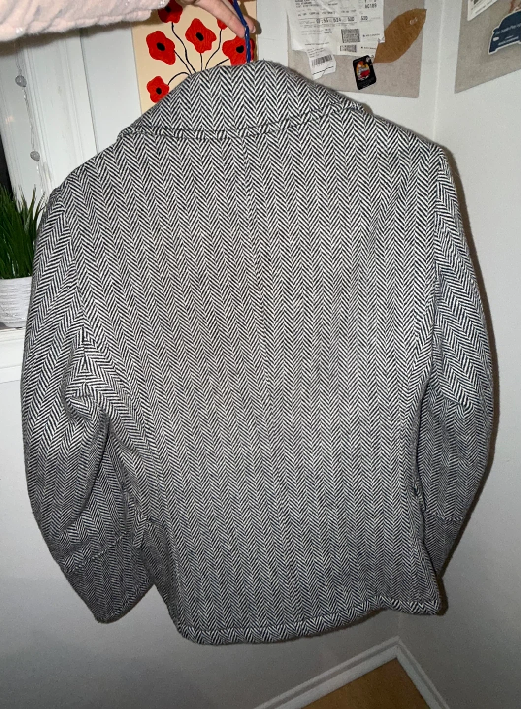 Here's a blazer with a unique herringbone pattern! It features a double-breasted design with gold-tone buttons, adding a touch of sophistication to any outfit.