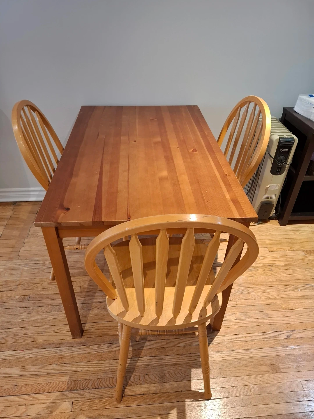 This is a light-coloured wood dining set with a rectangular table and four matching chairs. The chairs have spindle backs and rounded seats. It's a nice set for a smaller kitchen or dining area.