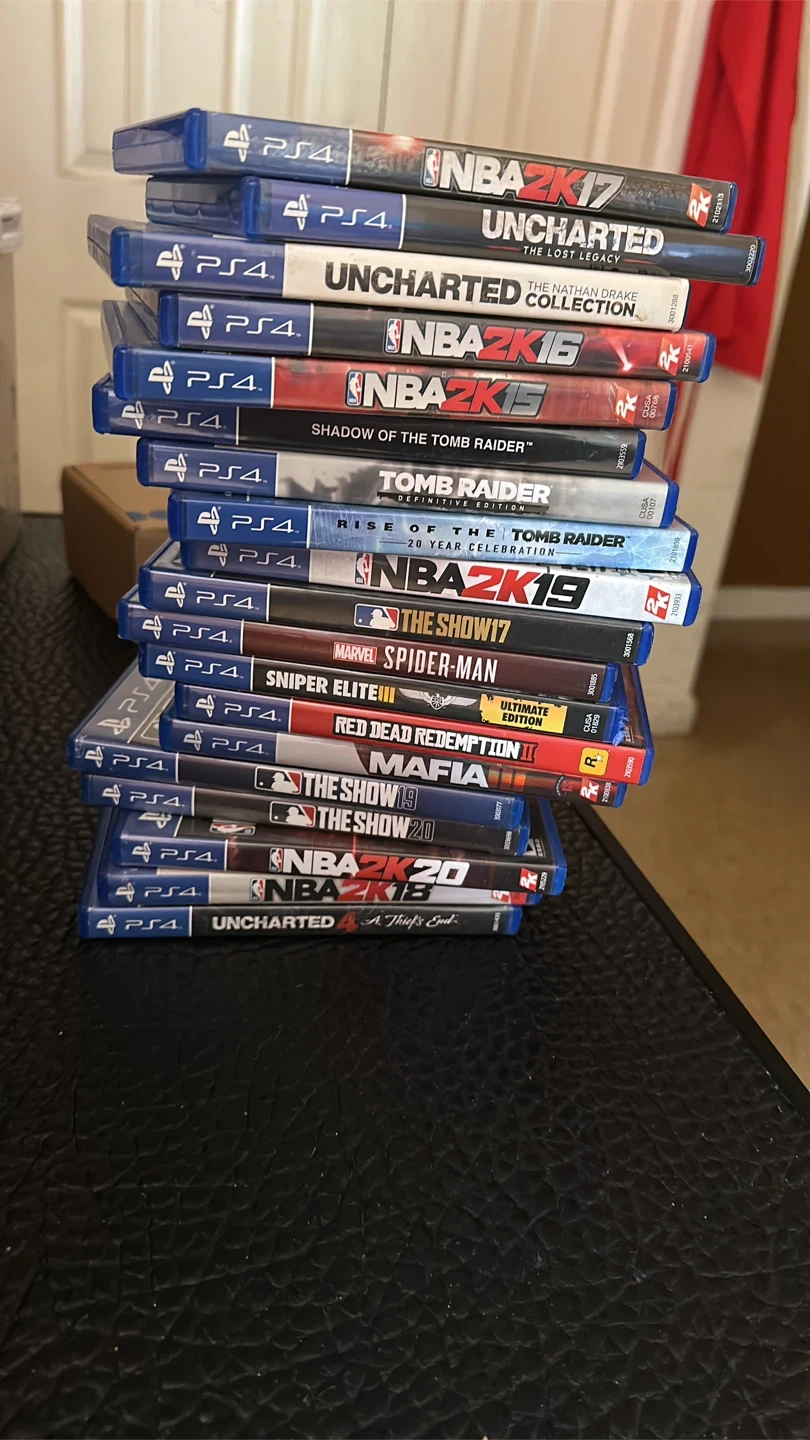 Bundle of 13 PlayStation 4 games. Includes NBA 2K series, Uncharted series, Tomb Raider series, The Show series, Spider-Man, Sniper Elite III, Red Dead Redemption II, and Mafia. All discs are for PS4.