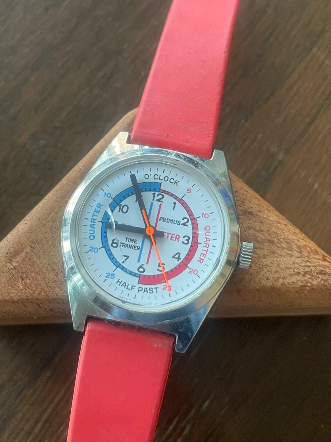 This Vintage Citron Time Trainer watch is great for learning to tell time! It has a white face with clear quarter hour markings. The red band is adjustable. Japan movement.