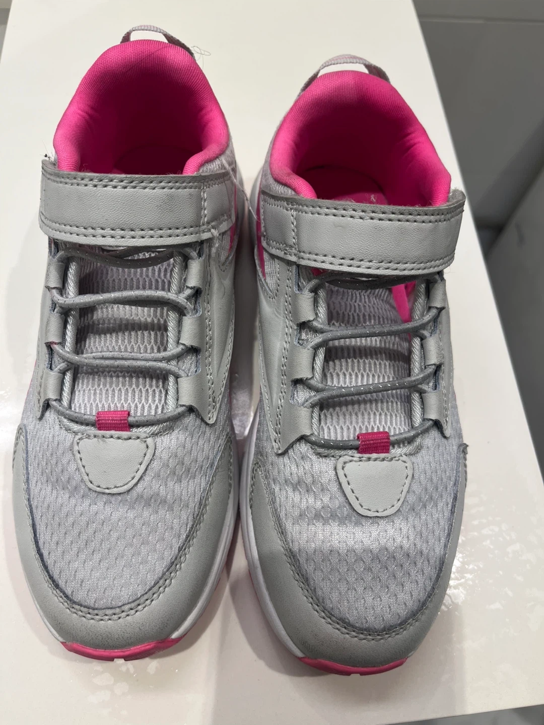 Gray and pink athletic shoes for kids. Features hook-and-loop straps with elastic laces for easy on and off. Includes original box. Size 1 US.