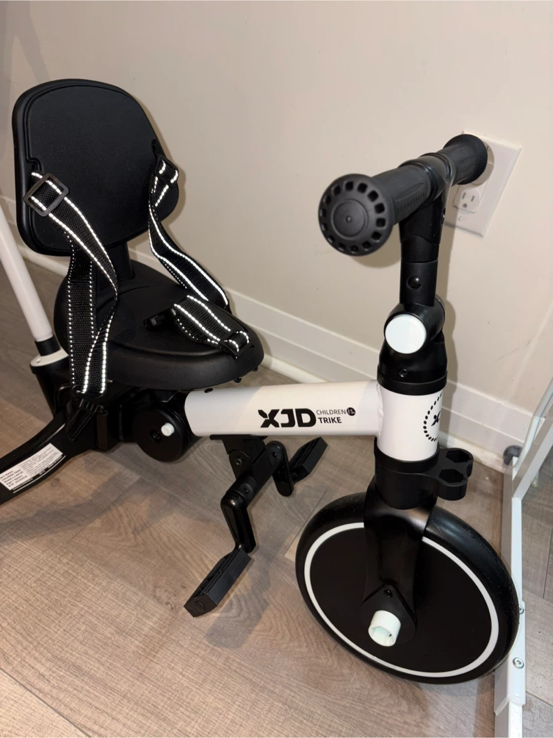 This XJD children's trike is designed for little ones. It features a comfortable seat with a safety harness and adjustable parent handle. The trike's frame is made of metal and plastic.