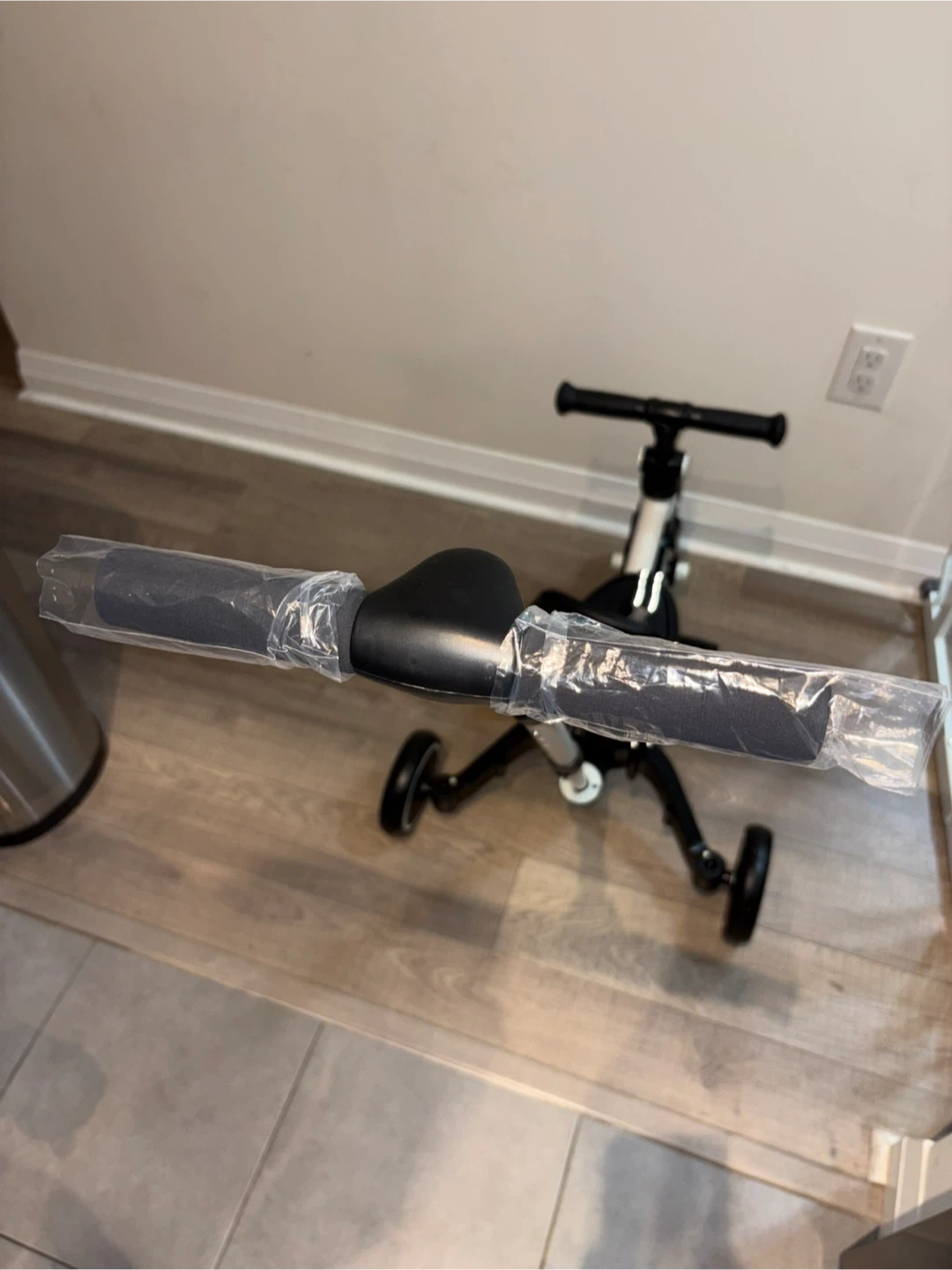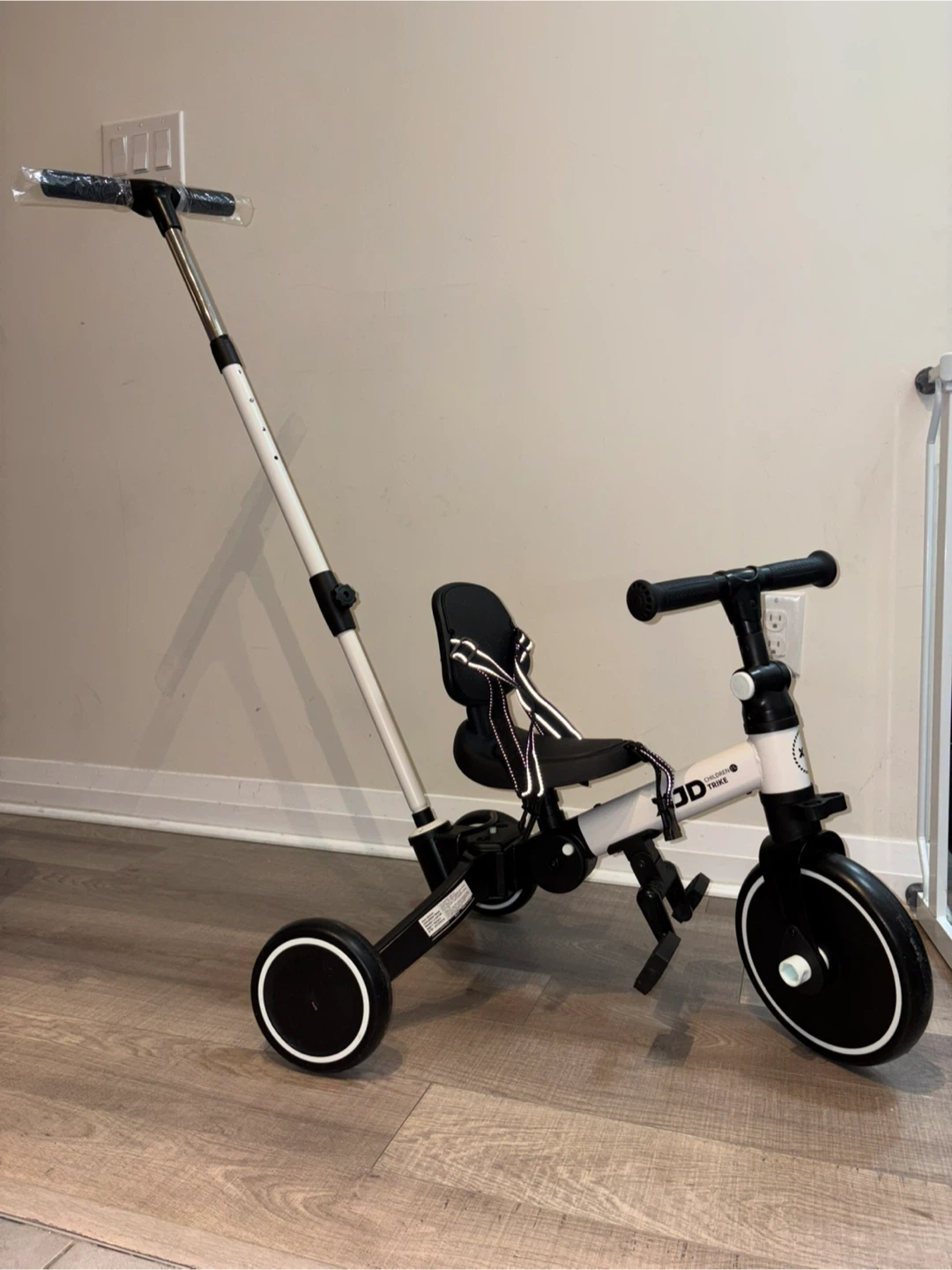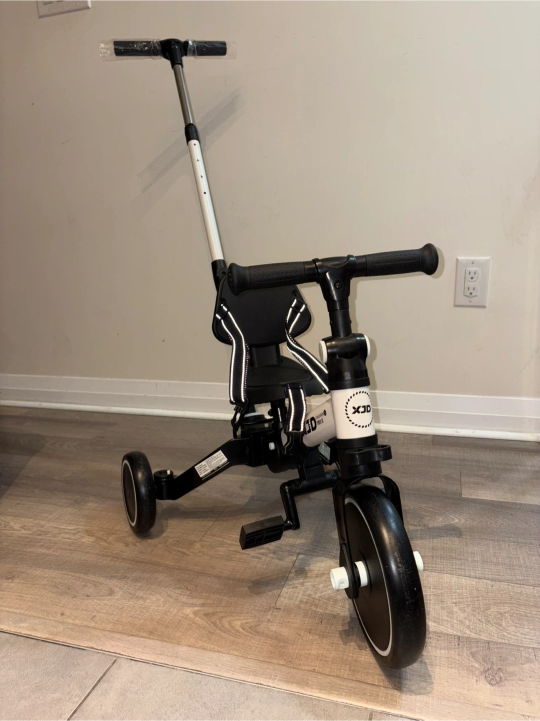 This XJD children's trike is designed for little ones. It features a comfortable seat with a safety harness and adjustable parent handle. The trike's frame is made of metal and plastic.
