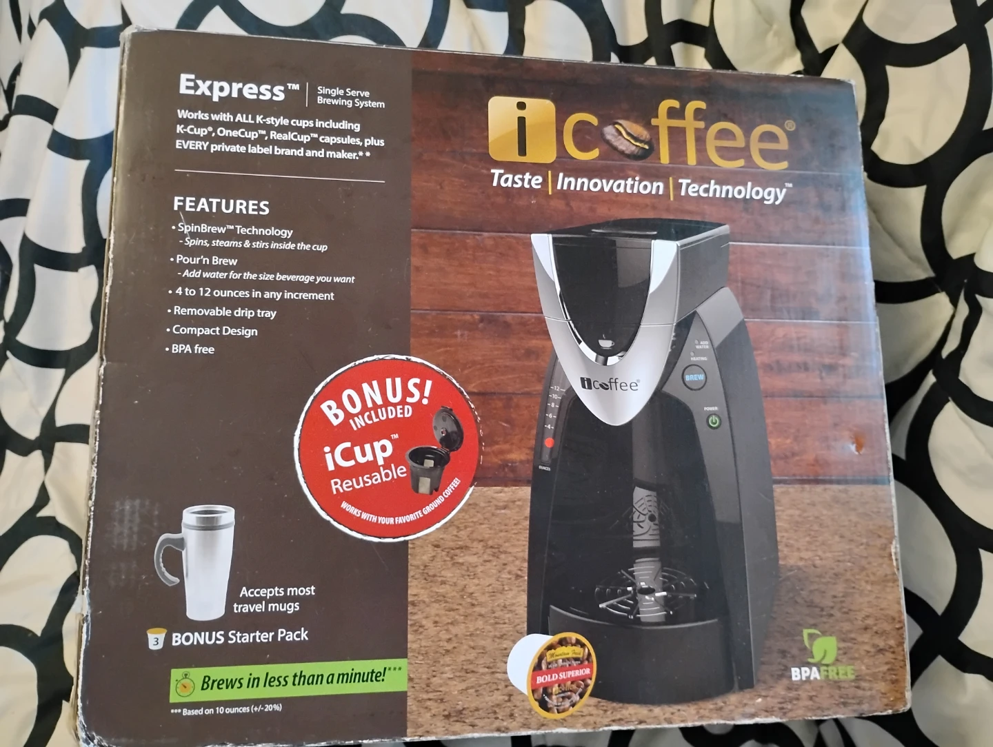 The iCoffee Express single serve brewing system uses SpinBrew technology to spin, steam, and stir inside the cup, creating a mini French press like effect.