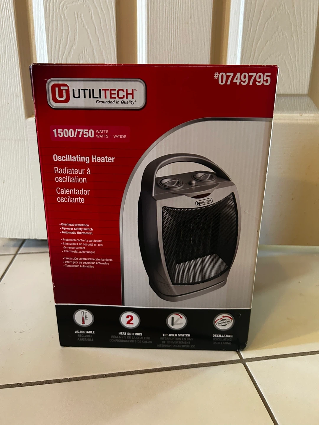 This BRAND NEW Utilitech oscillating ceramic heater provides 1500/750 watts of power. It features overheat protection, a thermostat, and a tip-over switch for safety. Adjustable heat settings make it easy to find your desired temperature. This heater is great for keeping small to medium rooms comfortable during colder months.