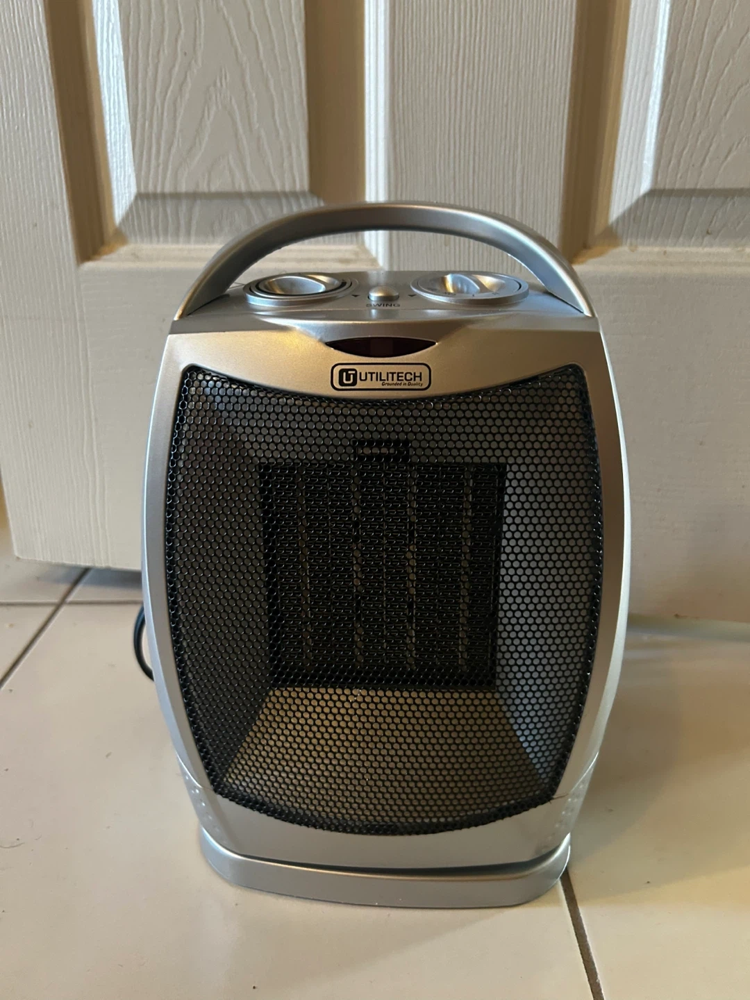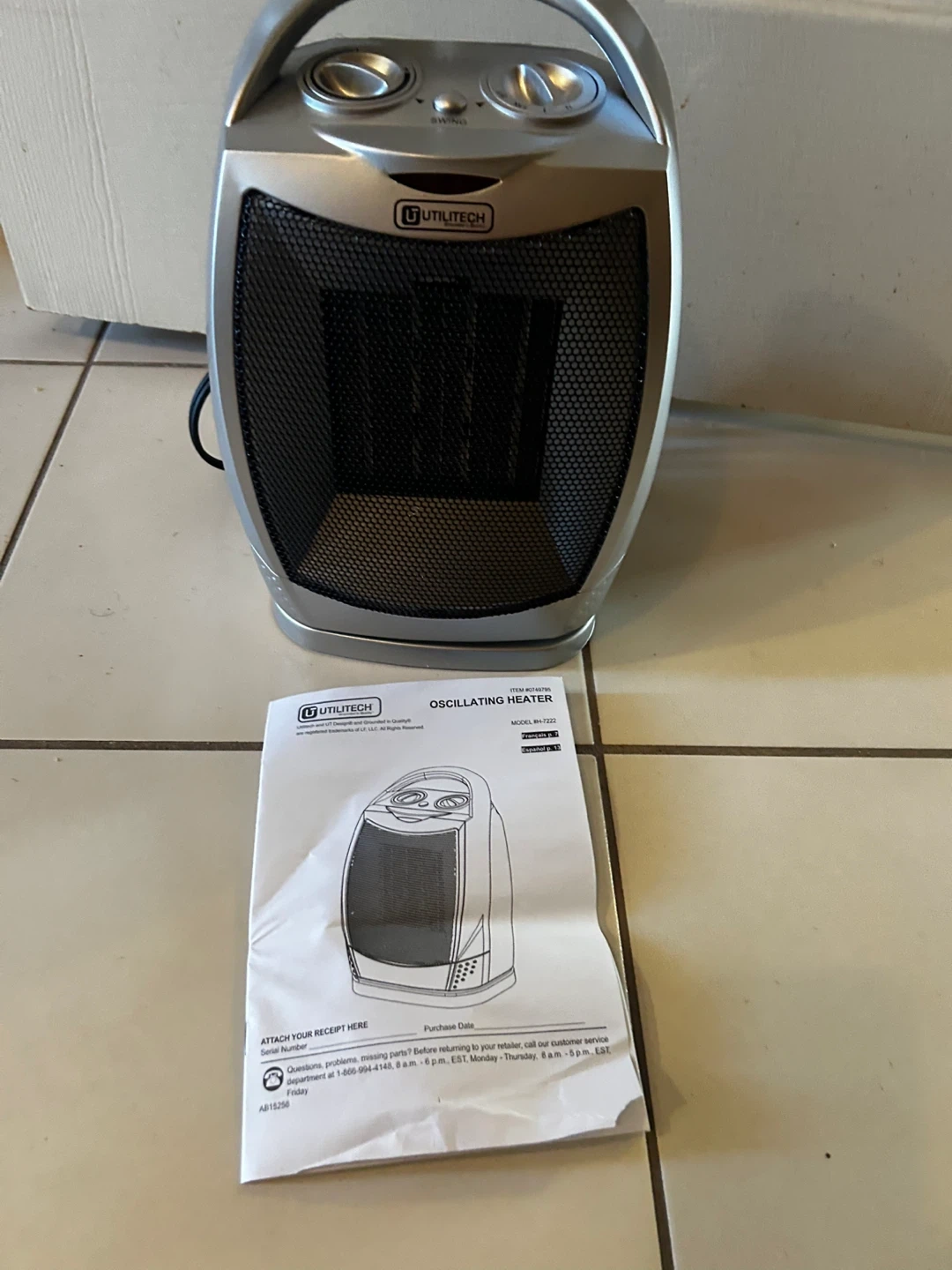 This BRAND NEW Utilitech oscillating ceramic heater provides 1500/750 watts of power. It features overheat protection, a thermostat, and a tip-over switch for safety. Adjustable heat settings make it easy to find your desired temperature. This heater is great for keeping small to medium rooms comfortable during colder months.