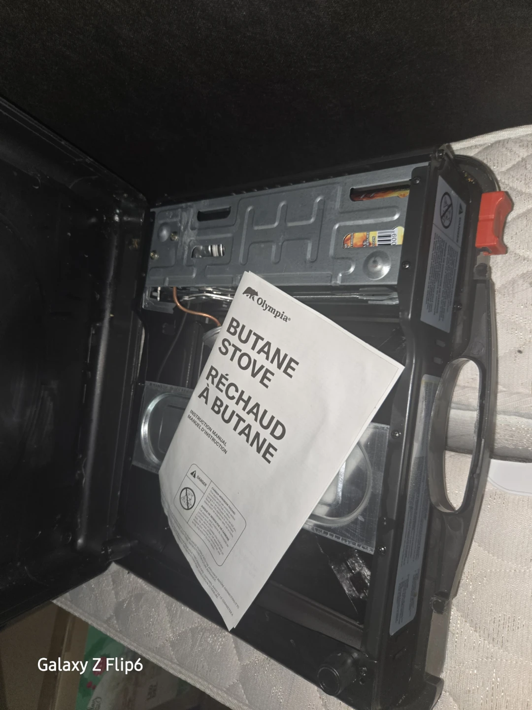 Olympia portable butane stove in a black carrying case. Includes instruction manual. It's a compact and convenient cooking solution for camping or emergencies.