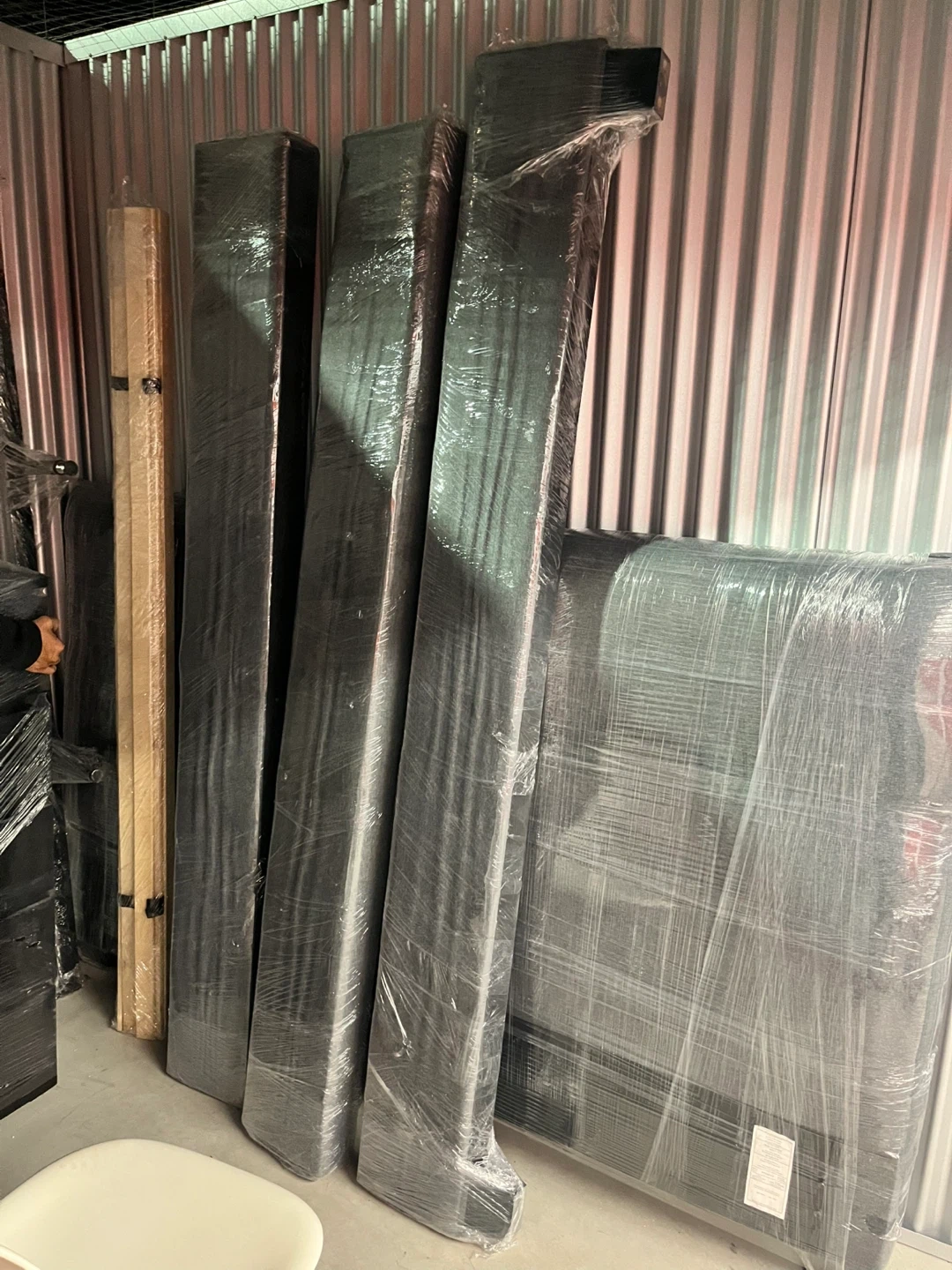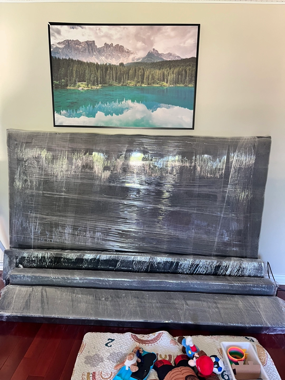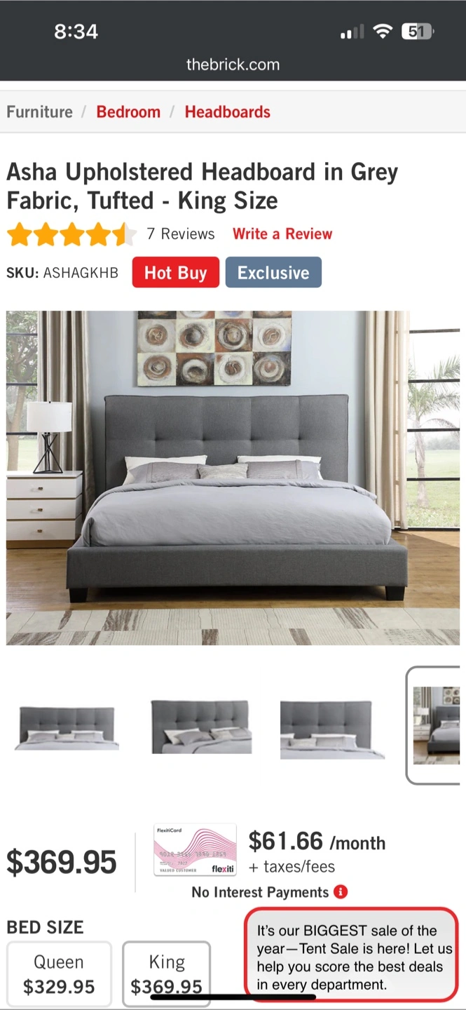 Selling a king -size Asha upholstered headboard in grey fabric. It's still wrapped up and ready for a new home! Originally bought for $369.95 from The Brick.
