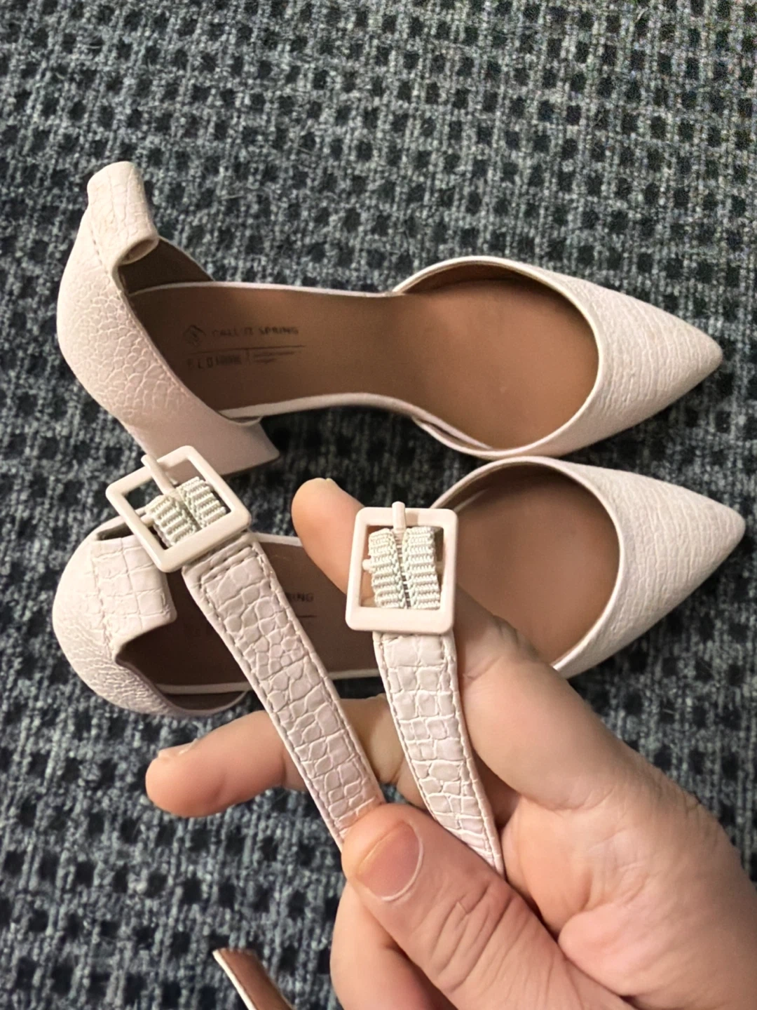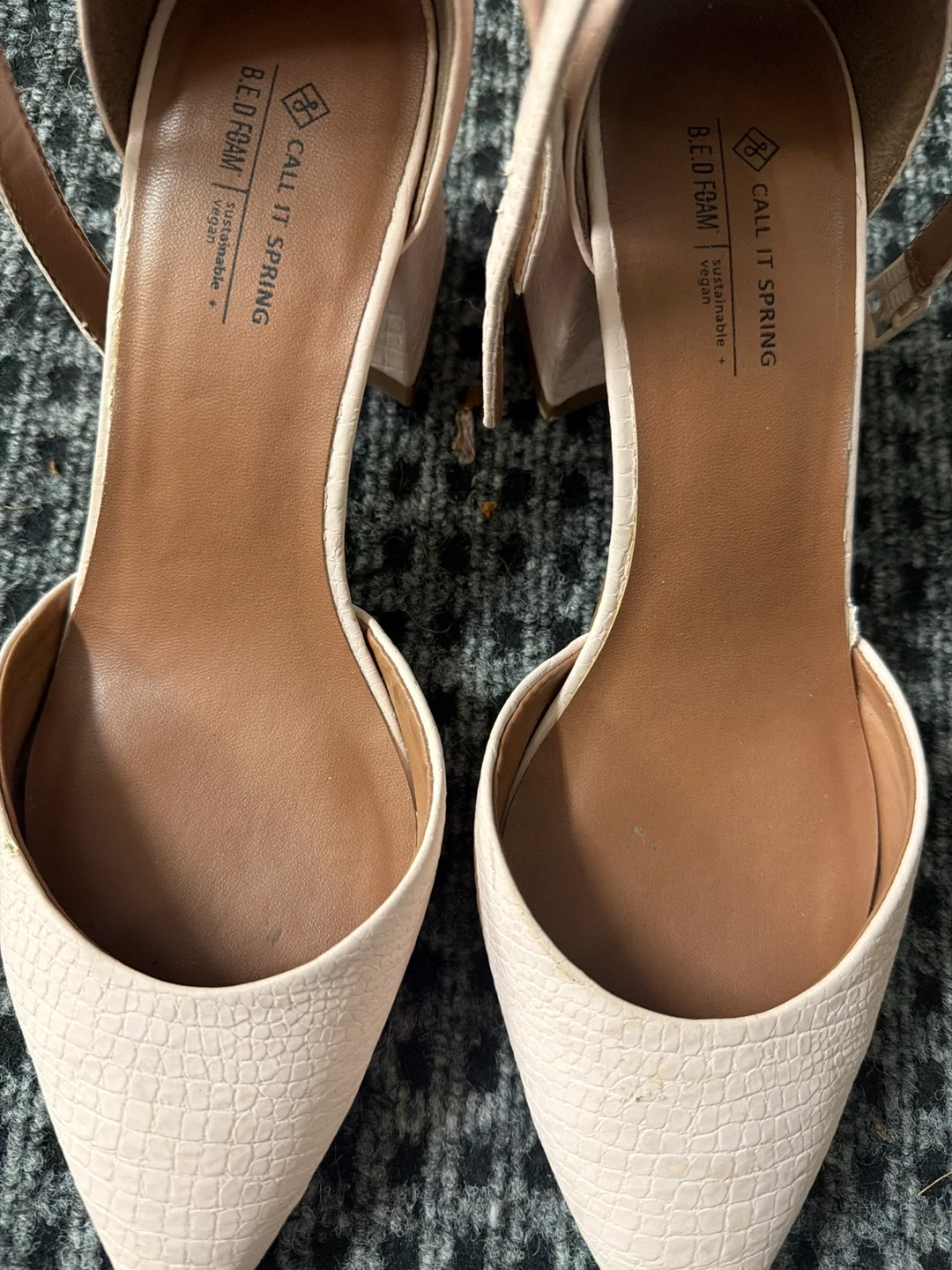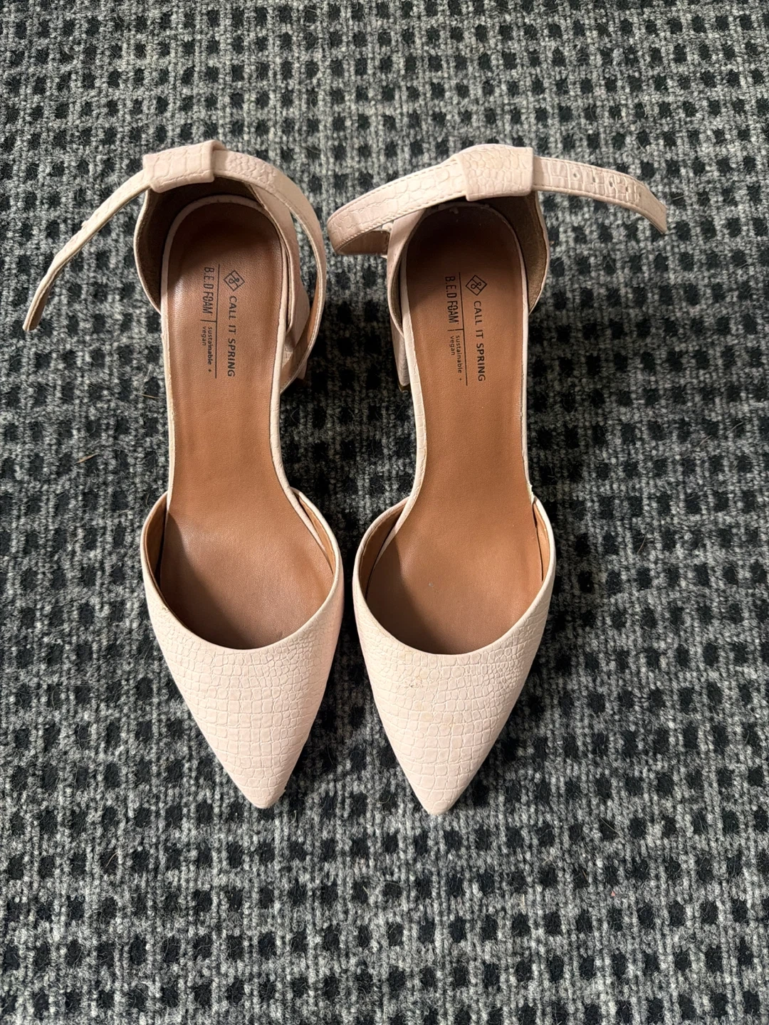 Call It Spring heels with a pink croc-embossed finish. They feature an adjustable ankle strap with a buckle closure and a pointed toe. B.E.D. Foam sustainable vegan material.