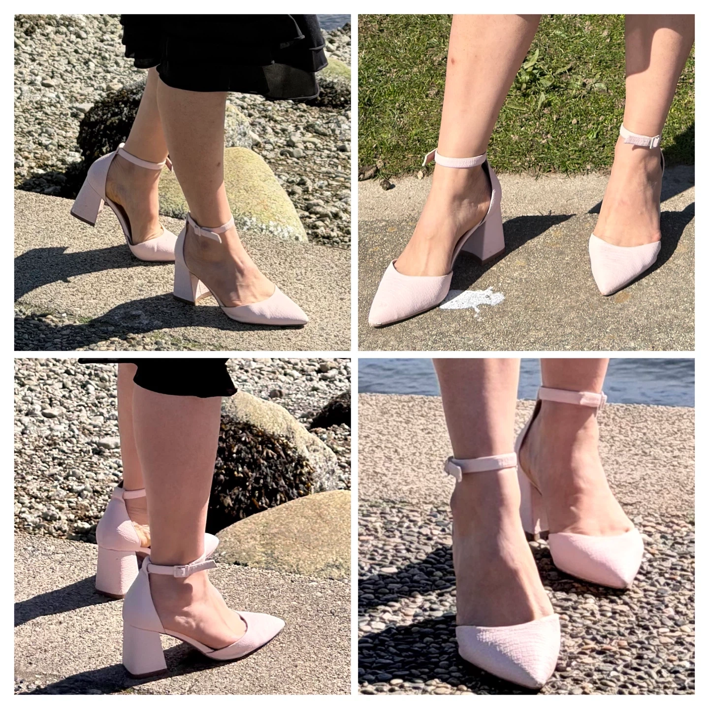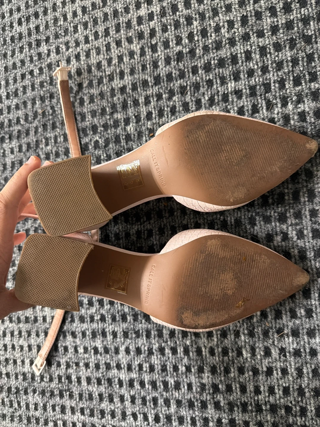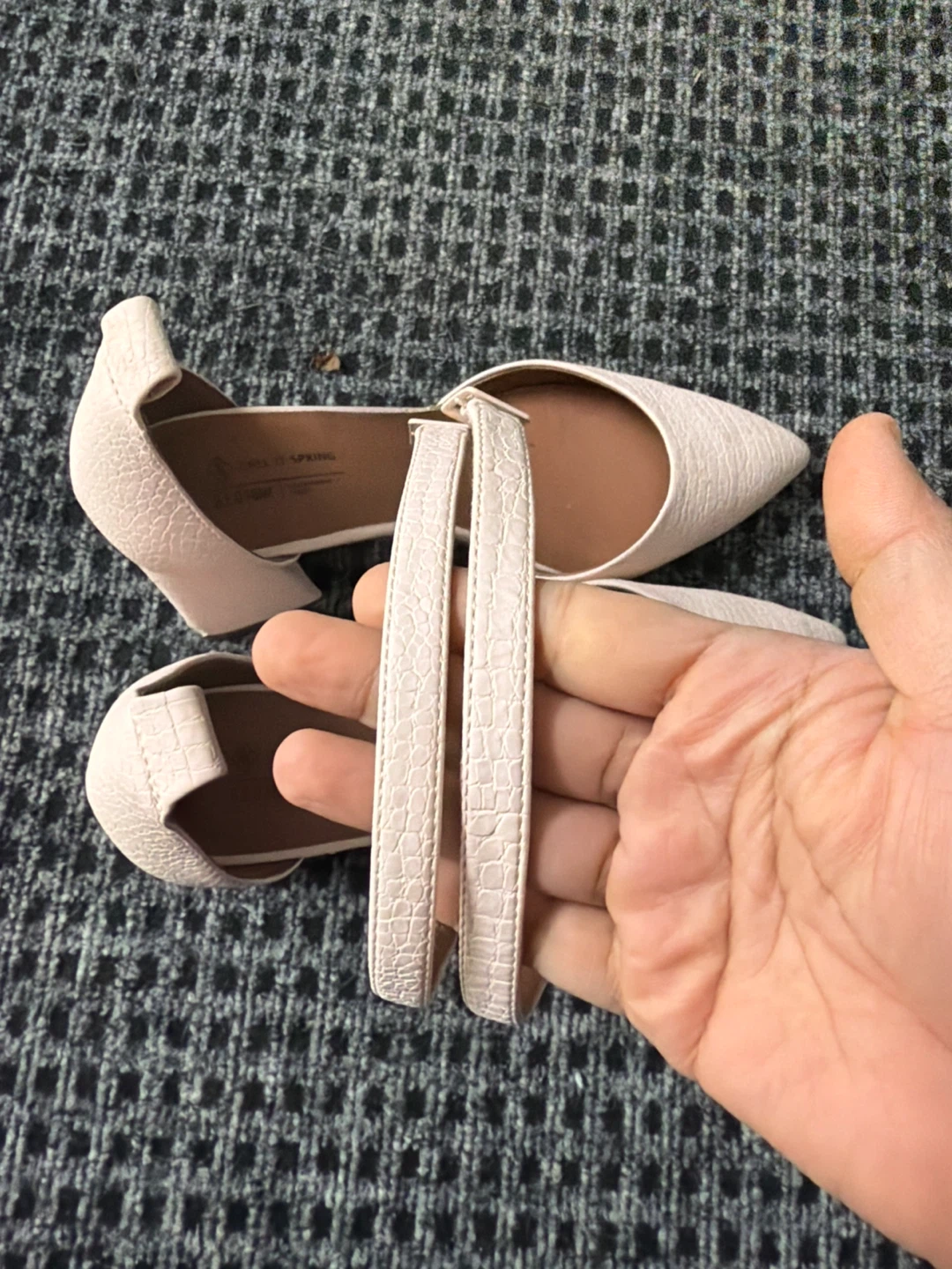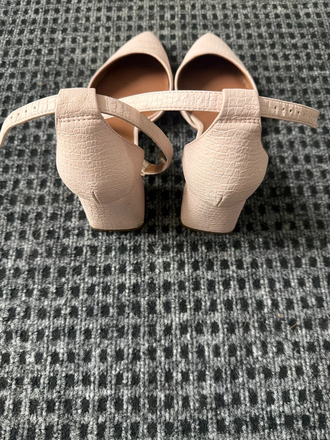 Call It Spring heels with a pink croc-embossed finish. They feature an adjustable ankle strap with a buckle closure and a pointed toe. B.E.D. Foam sustainable vegan material.