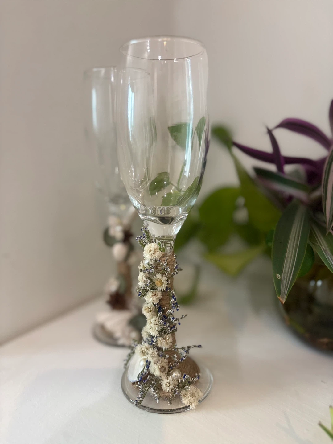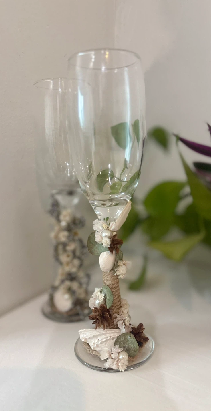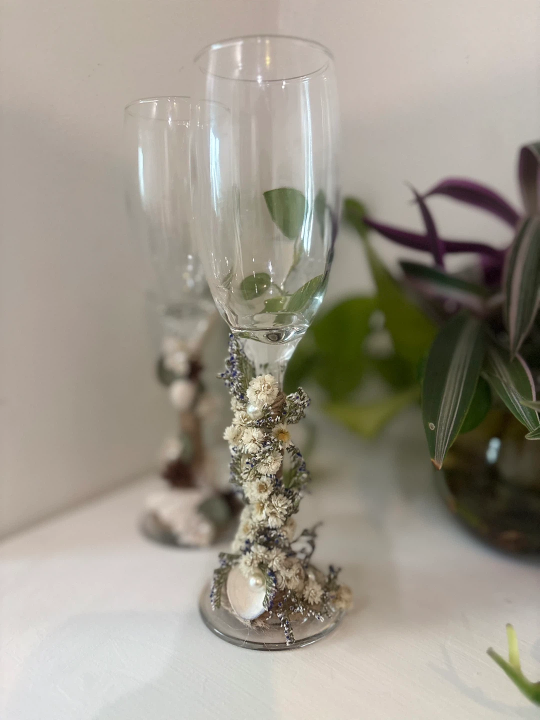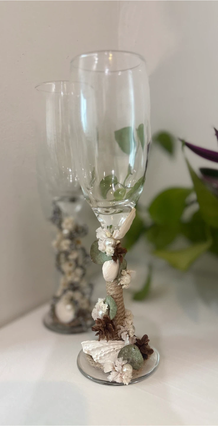 Selling a set of two decorated champagne flutes. They are clear glass with unique floral and shell embellishments around the stem and base. Perfect for a special occasion or as a decorative piece!