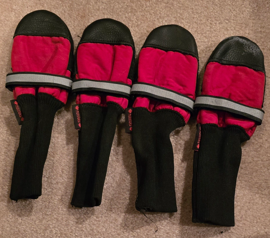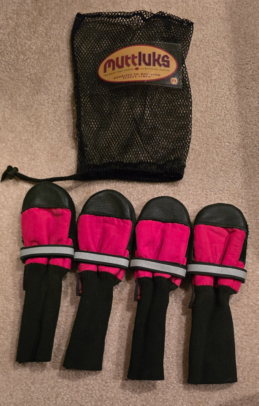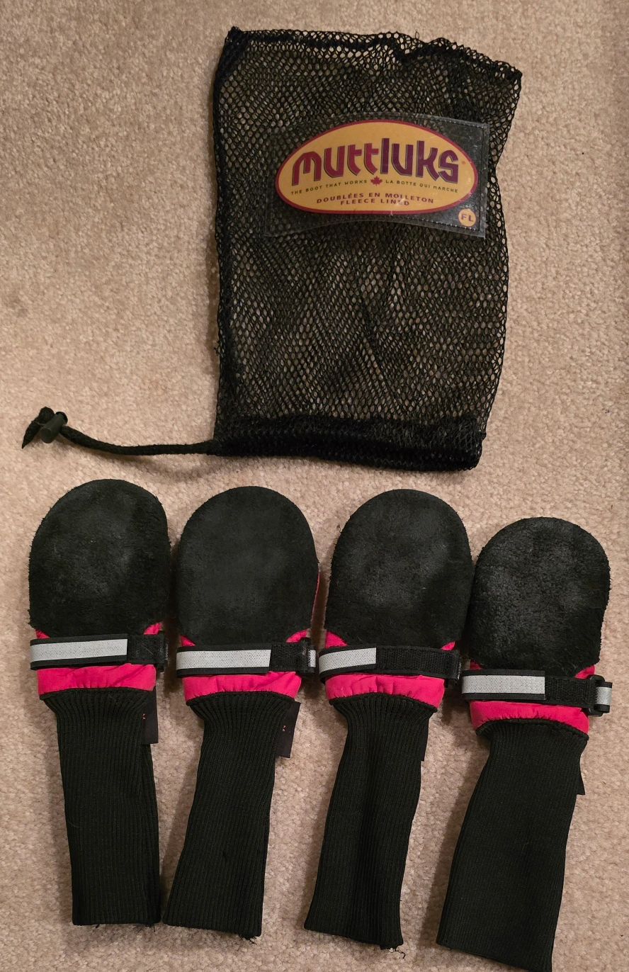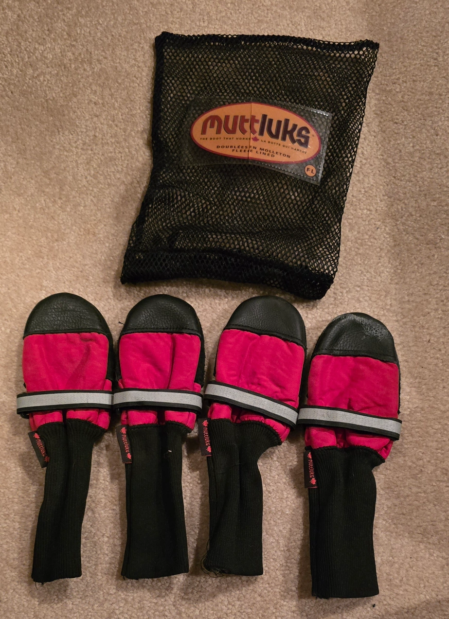 2 sets - Mutluks dog boots. Red with black trim. Fleece lined. Includes mesh storage bag. For large under 100lbs breeds