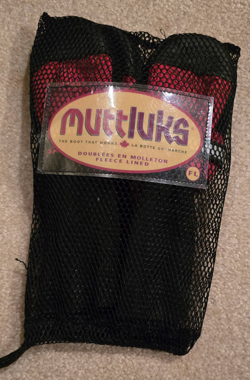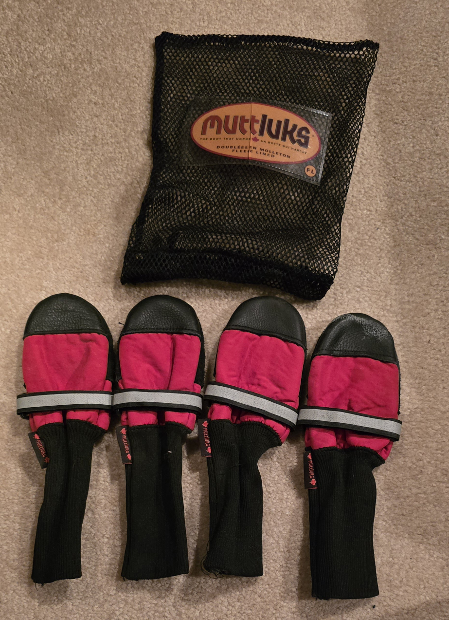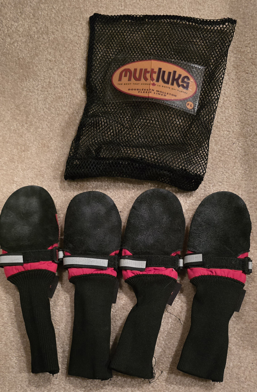 2 sets - Mutluks dog boots. Red with black trim. Fleece lined. Includes mesh storage bag. For large under 100lbs breeds