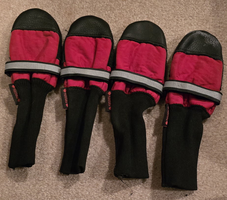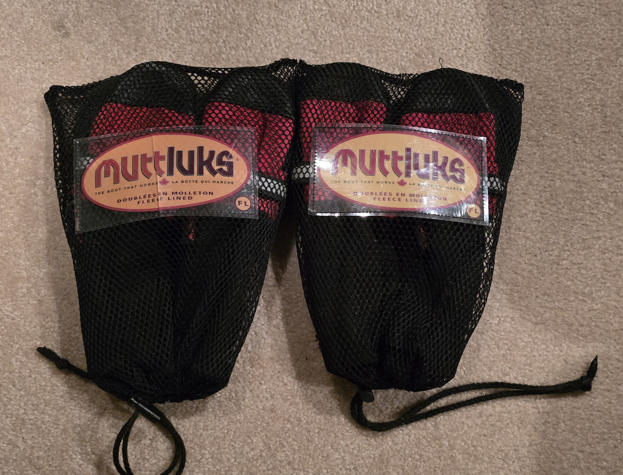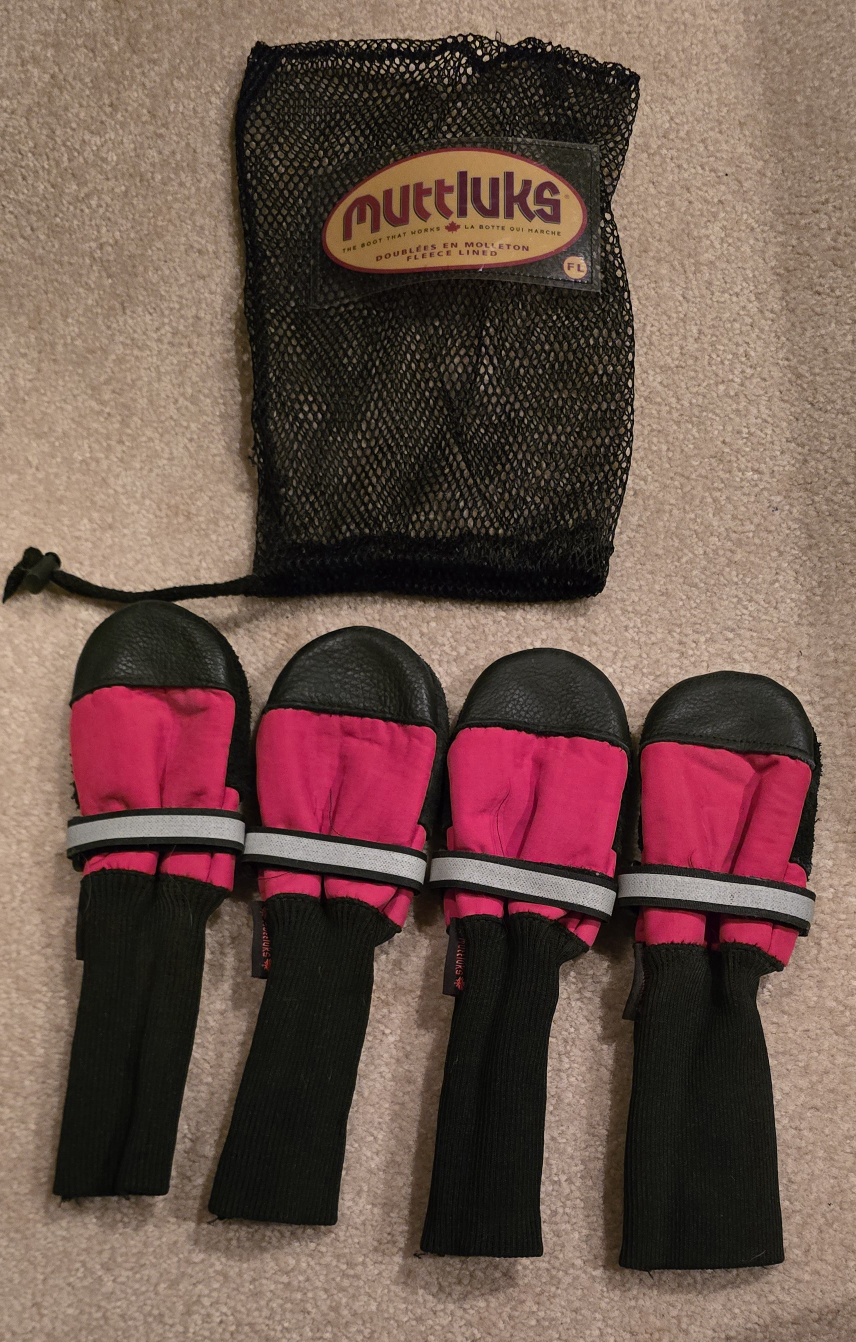 2 sets - Mutluks dog boots. Red with black trim. Fleece lined. Includes mesh storage bag. For large under 100lbs breeds