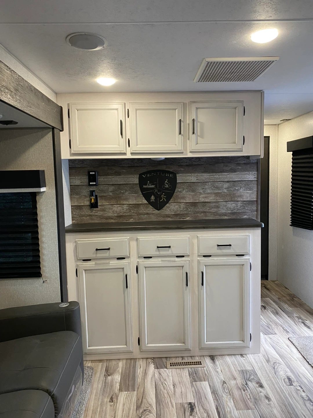 * Bedroom: Front master bedroom with a residential-size 60" x 80" queen bed, storage underneath and "Store More”nightstands with USB/110V outlets.