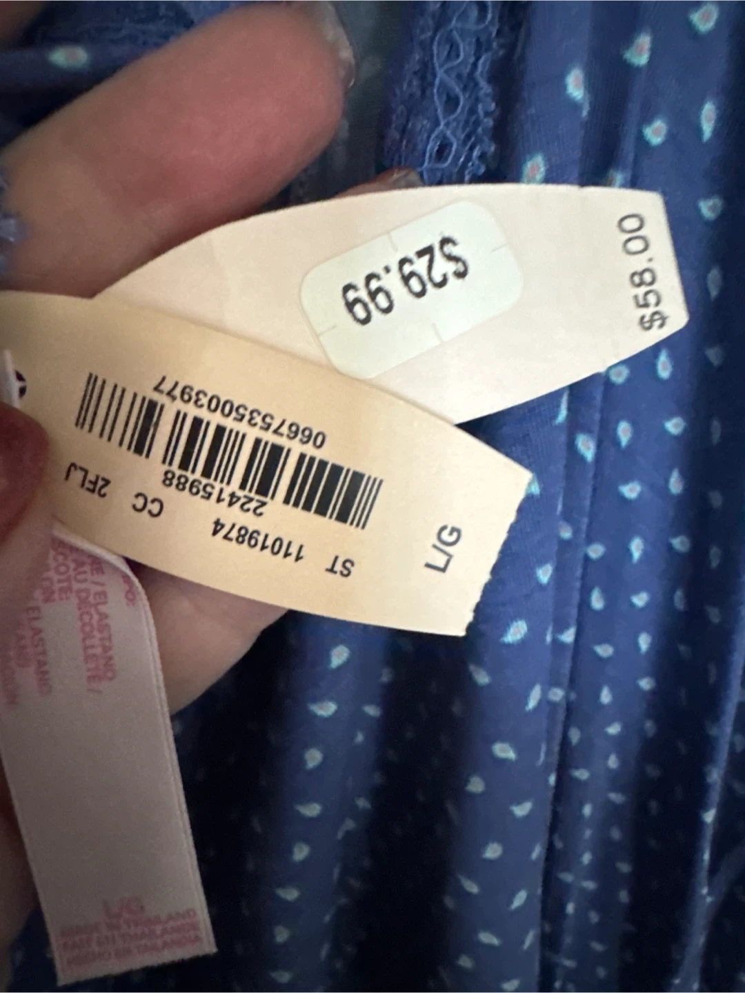 Victoria's Secret blue camisole with a polka dot pattern and lace trim. It's size L/G. Body is 83% modal, 17% elastane, with nylon/elastane decoration. Great for loungewear!