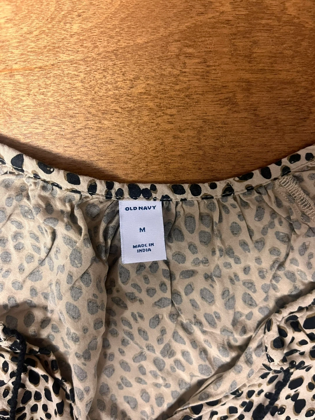 This Old Navy top features a beige and black leopard print. It's a size medium with a V-neck and tie details. The material is lightweight for comfortable wear.