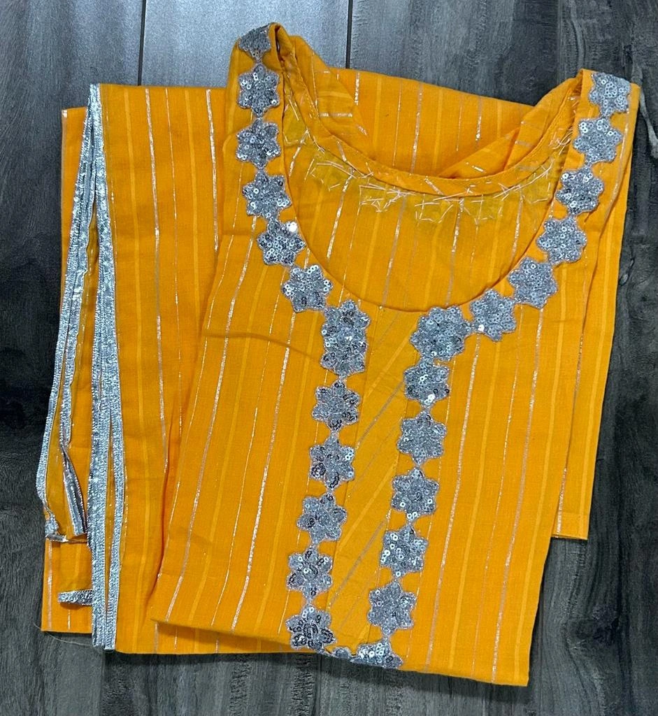 A yellow kurta with silver embroidery. It has a round neckline and 3/4 sleeves. The kurta is made of a soft, comfortable fabric and is perfect for everyday wear. It comes with a matching dupatta.