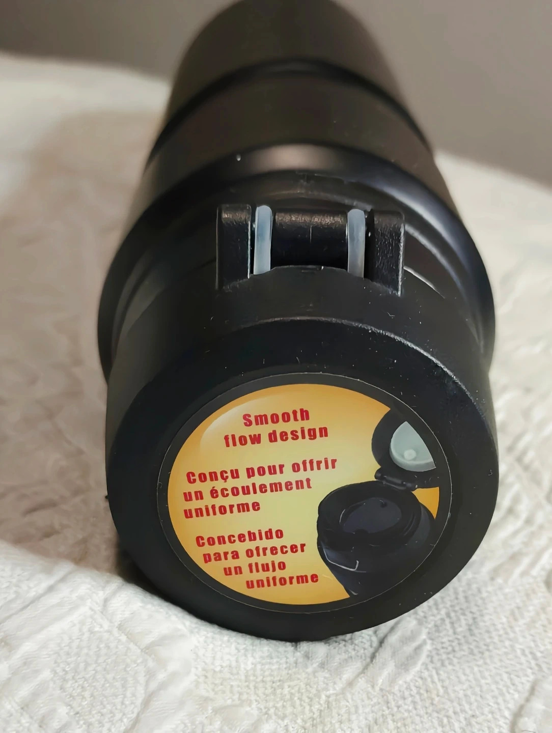 This is a black Thermos stainless steel vacuum insulated bottle. It has a smooth flow design for an even pour. It's great for keeping your drinks hot or cold on the go!