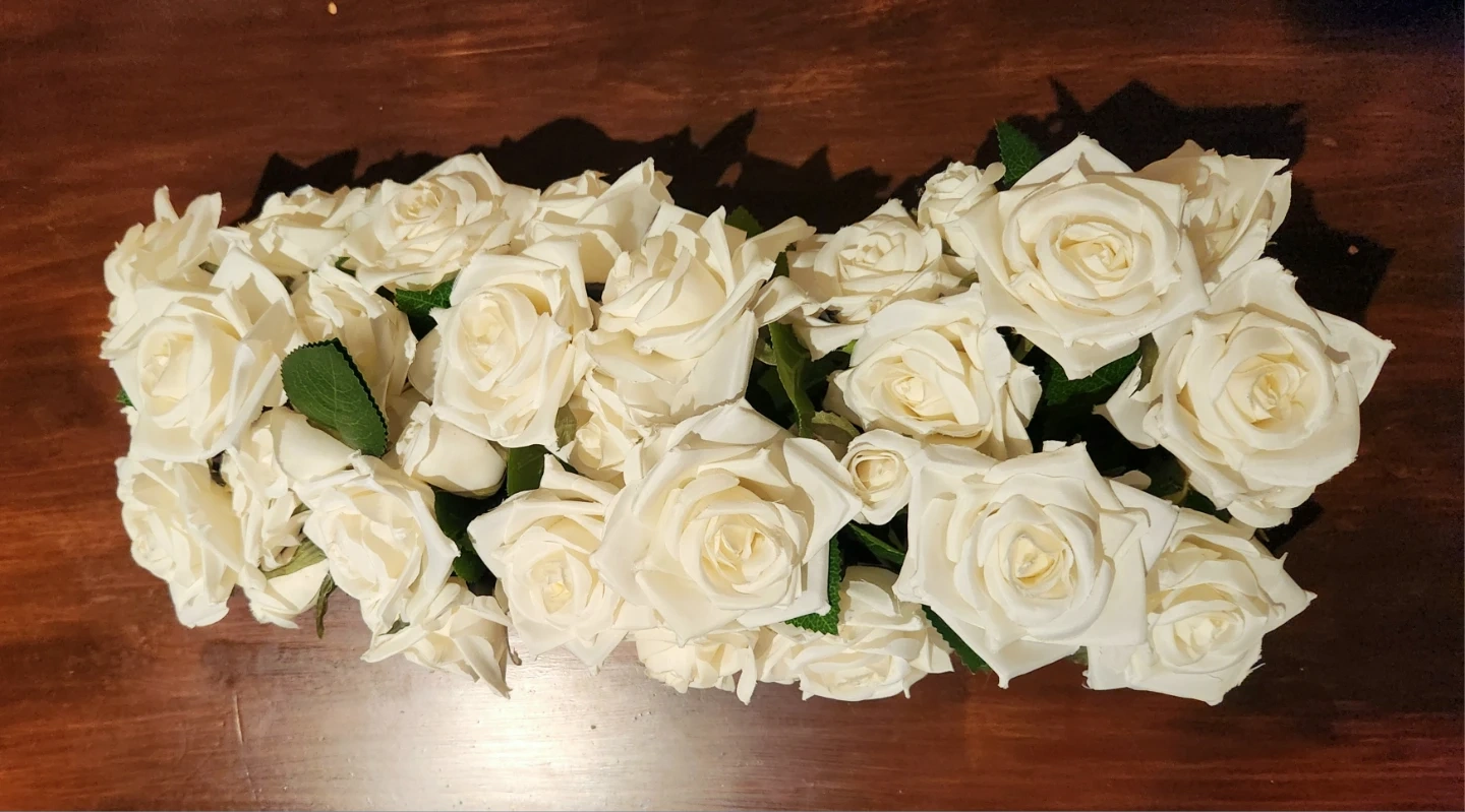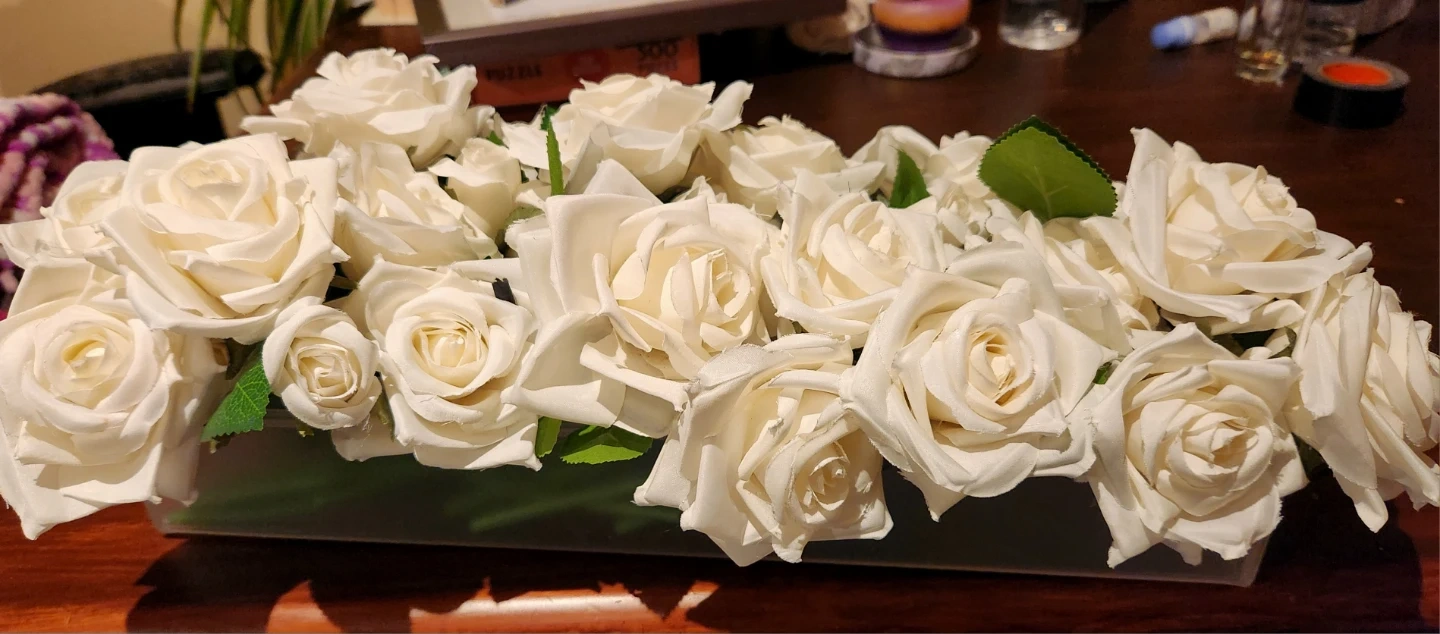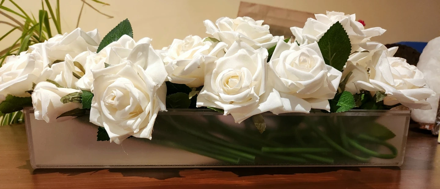 A faux floral arrangement featuring numerous white roses in a clear rectangular box. Great as a centerpiece for outdoor informal weddings or other special occasions.