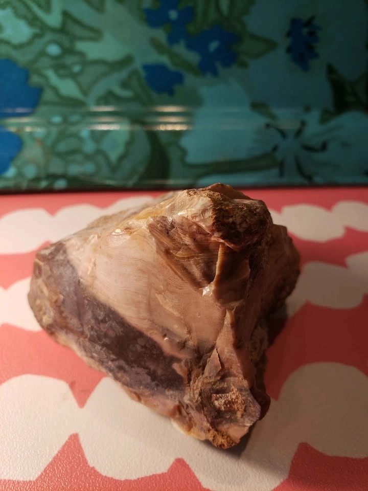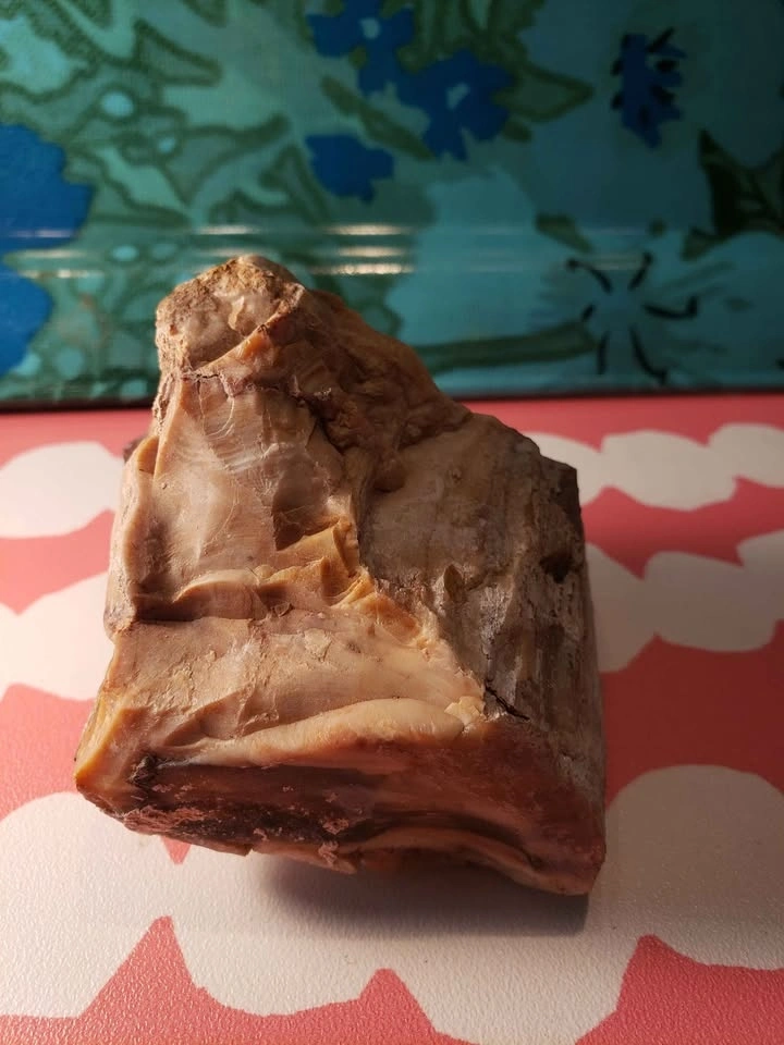 Beautiful natural stone with warm tones in the banding. Semi-translucent in areas with unique layered patterns. Solid but not overly heavy — perfect for a desk, bookshelf, or decorative accent. One-of-a-kind piece. Approx. 8 cm x 6 cm x 6 cm. 350g.