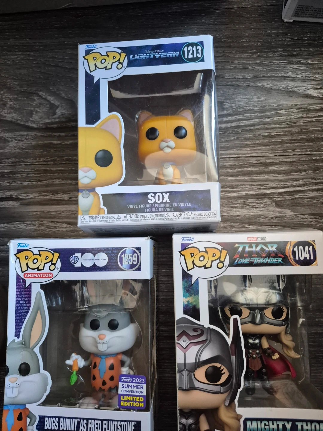Collectibles include Funko Pop! Sox from Lightyear the box is damaged, Bugs Bunny as Fred Flintstone from Looney Tunes the box is also damaged, and Mighty Thor from Thor: Love and Thunder. All figures come in their original boxes.