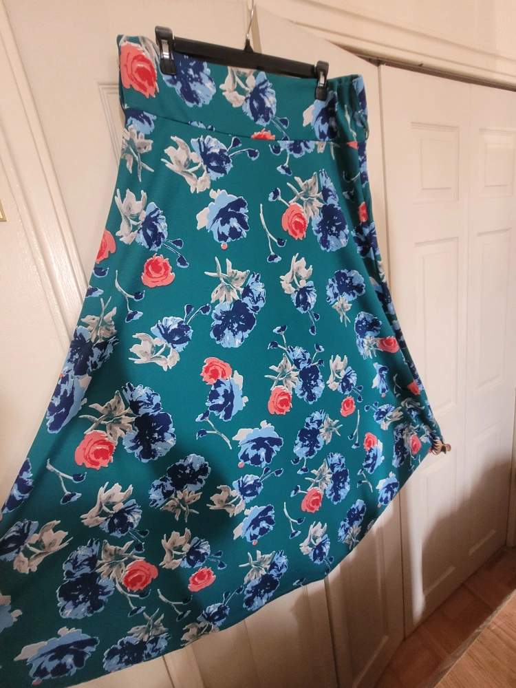 Selling a beautiful Maccine maxi skirt in size XL! It features a lovely teal background with a floral print in shades of blue and coral. Perfect for adding a pop of colour to your wardrobe!