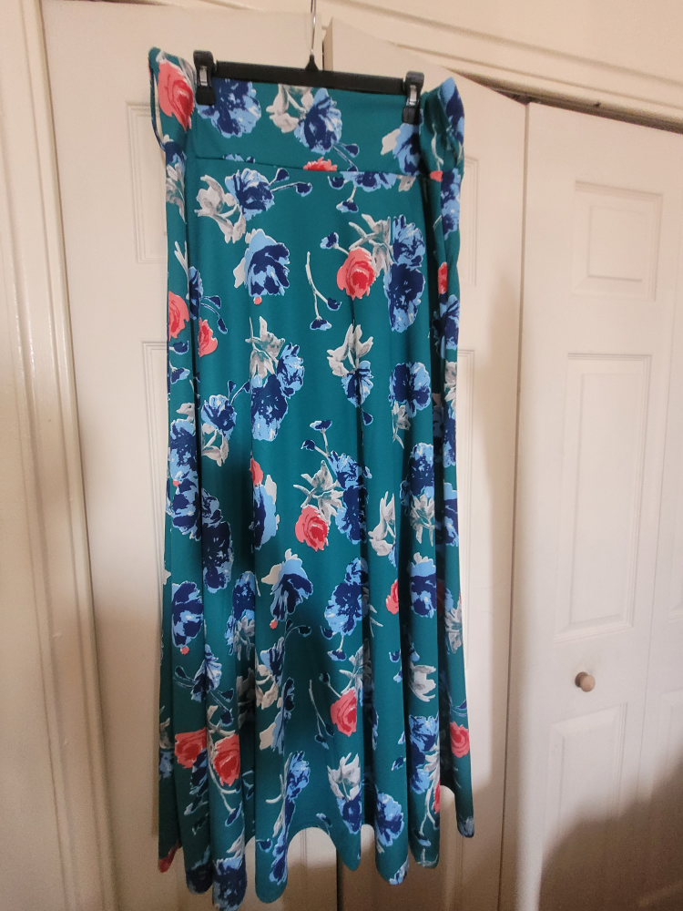 Selling a beautiful Maccine maxi skirt in size XL! It features a lovely teal background with a floral print in shades of blue and coral. Perfect for adding a pop of colour to your wardrobe!