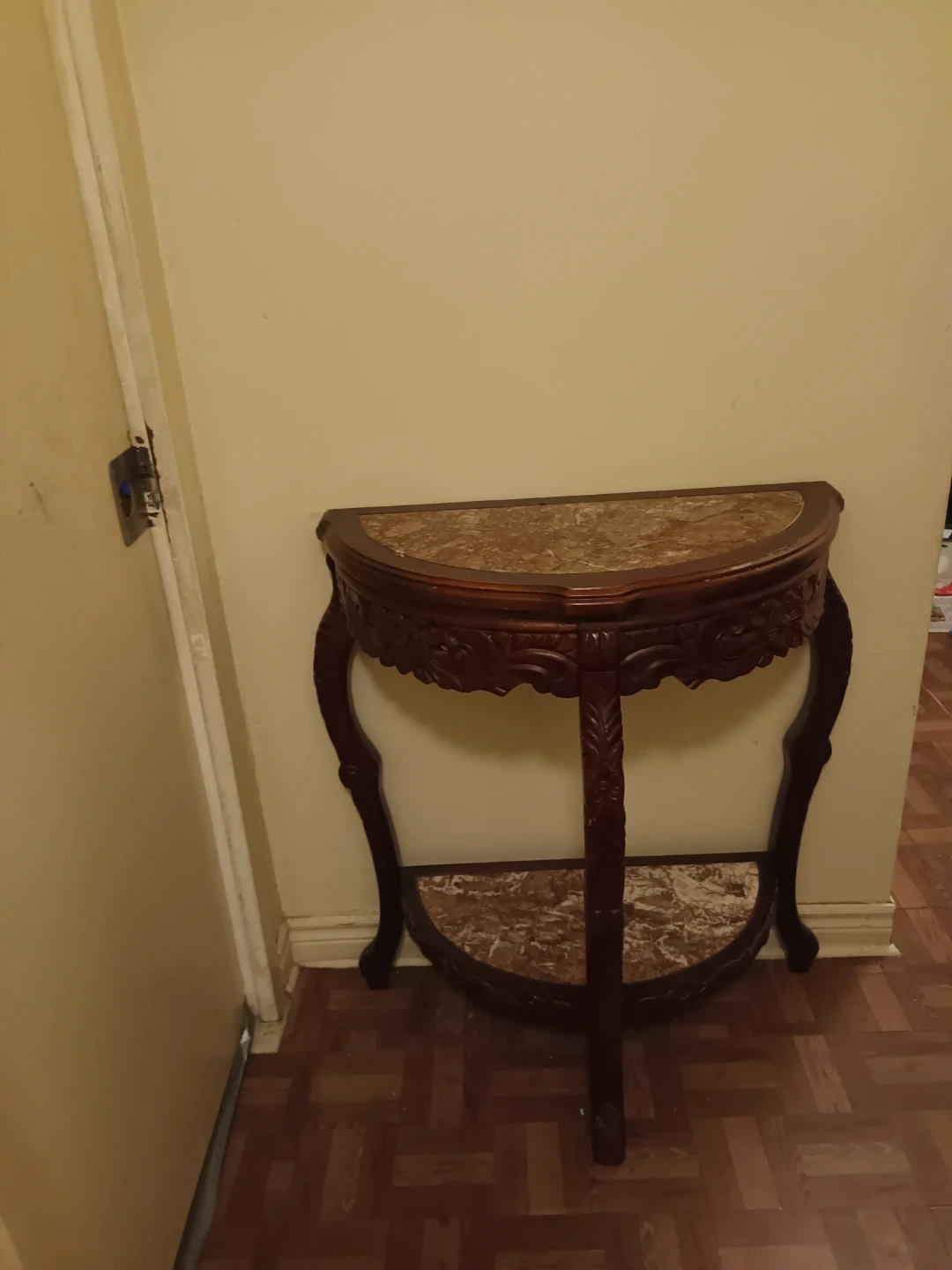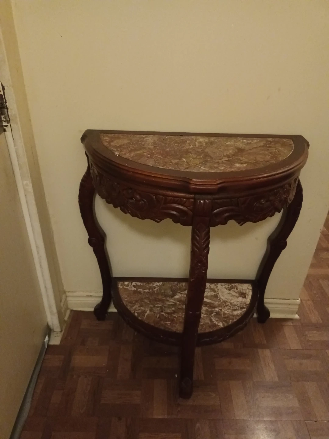 Selling a lovely half-moon accent table with a marble top. It's in great shape and would look perfect in an entryway or living room. The dark wood finish and carved details add a touch of elegance to any space