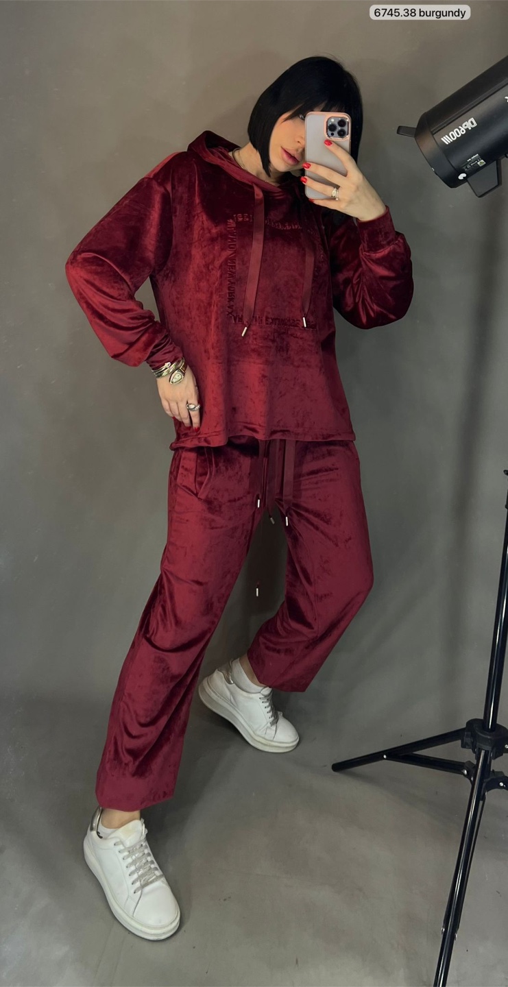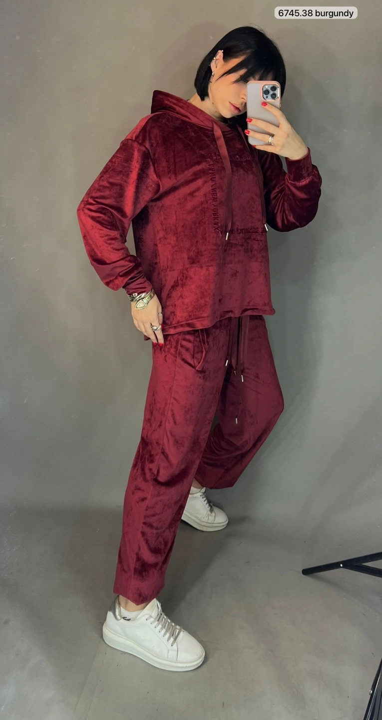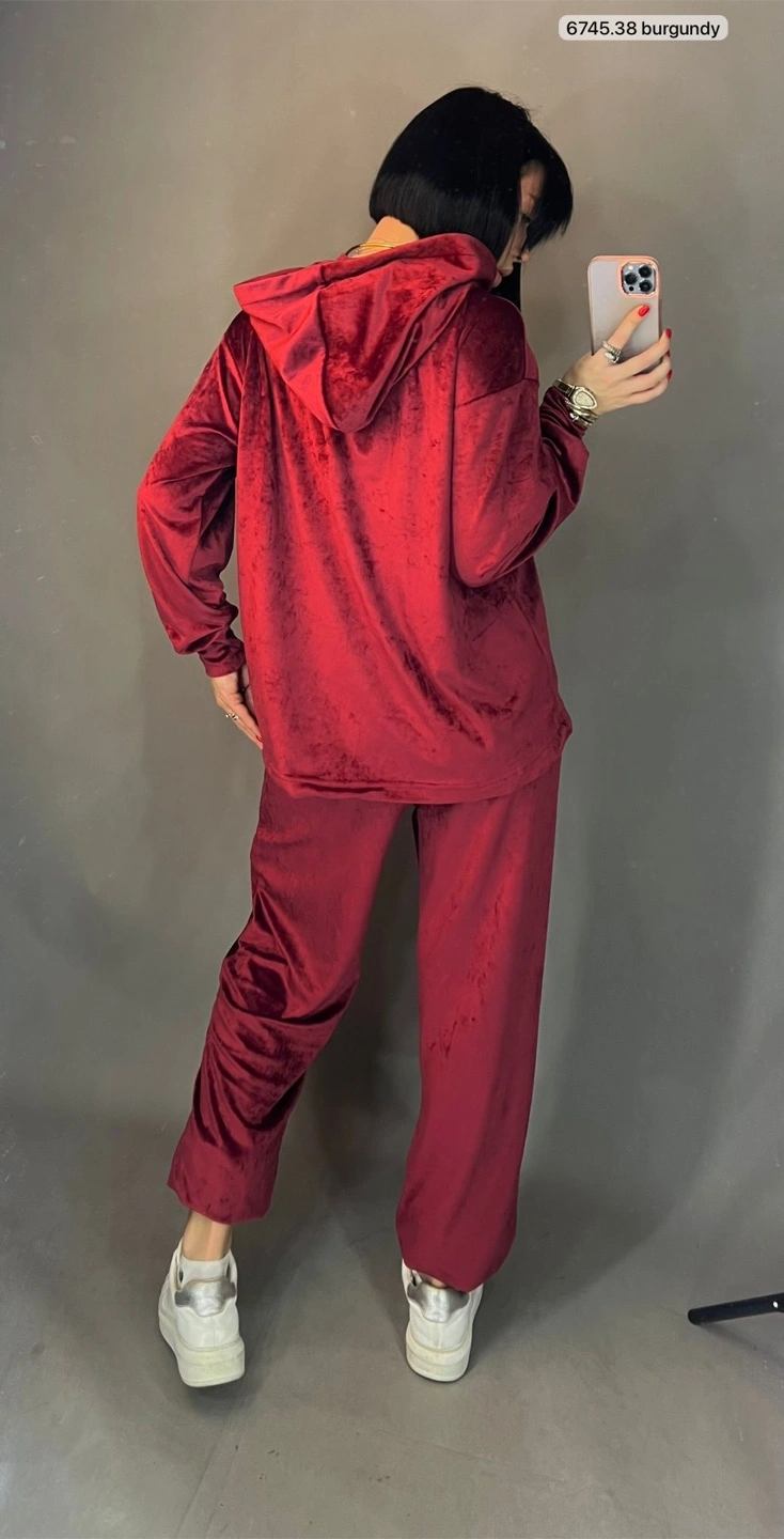 A comfy and stylish burgundy velvet set that includes a hoodie and matching pants. The material is soft and perfect for lounging around the house or running errands. The set is in great condition!