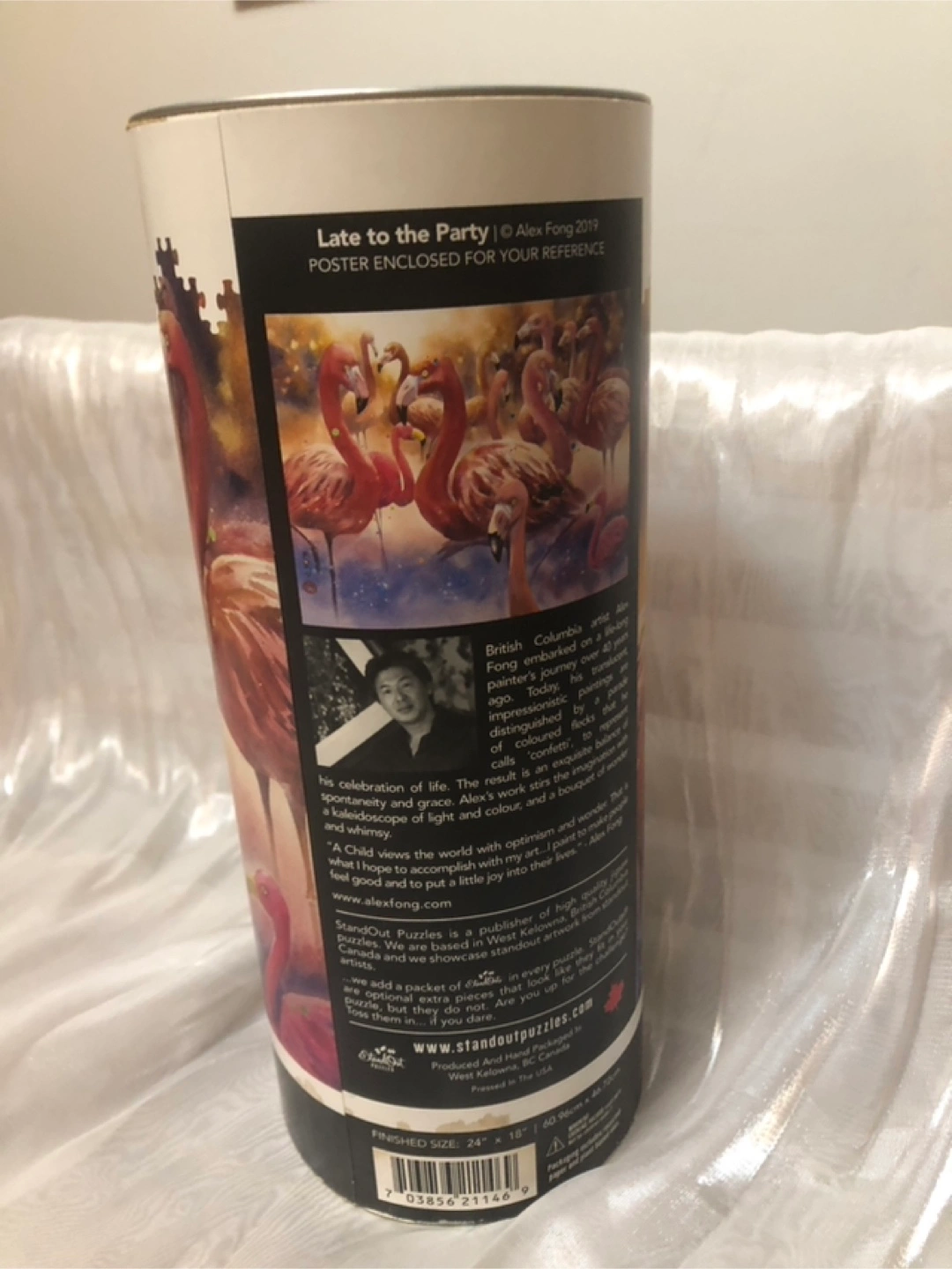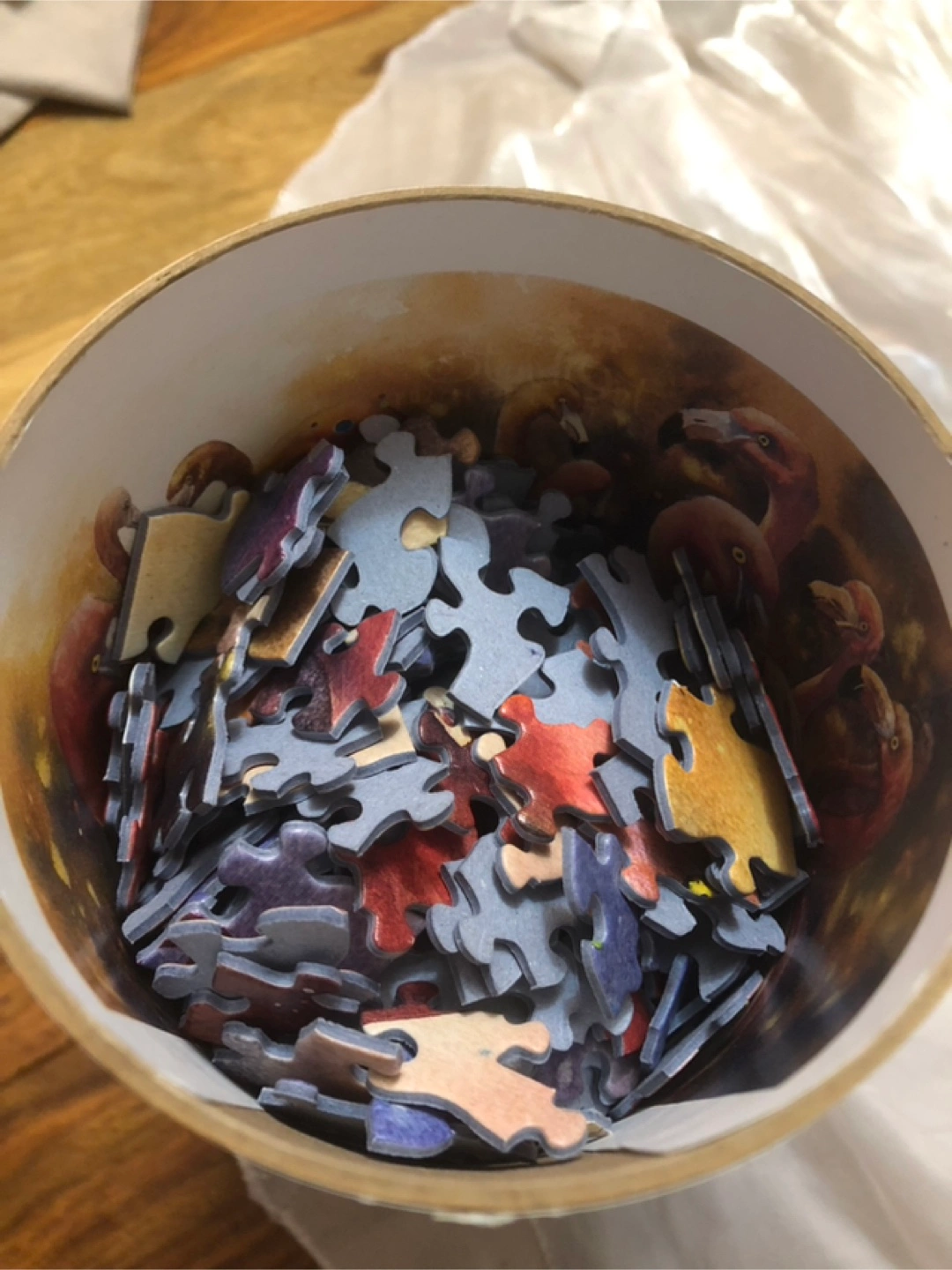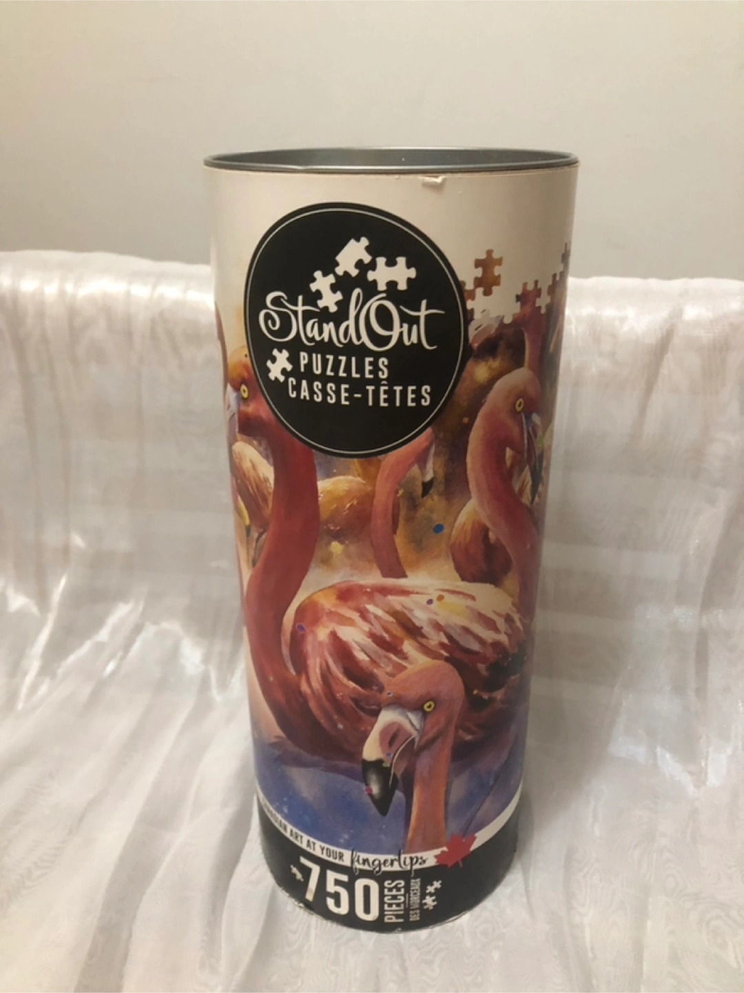 Complete 750-piece jigsaw puzzle. Features flamingos. Comes in a cylindrical container. Poster included as well as extra pieces in a bag to make it more difficult if you choose.