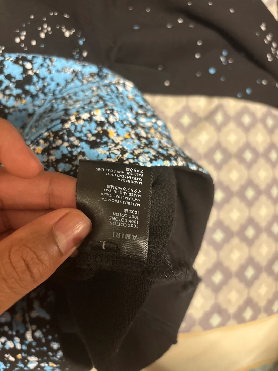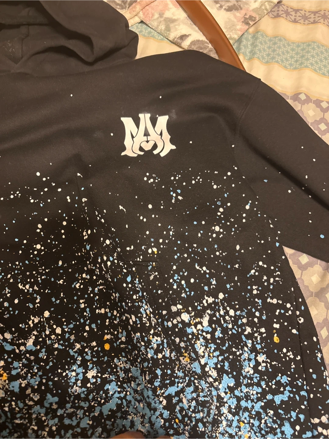 Black hoodie by AMIRI with a unique splatter print design. Made from 100% cotton in the USA. Features a classic hooded silhouette with a distinctive graphic detail on the front.