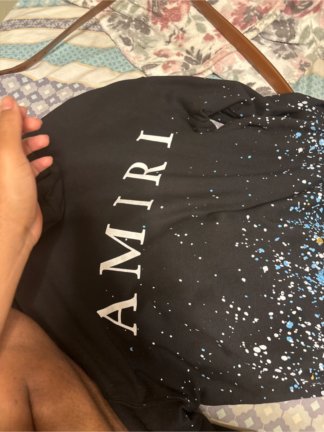 Black hoodie by AMIRI with a unique splatter print design. Made from 100% cotton in the USA. Features a classic hooded silhouette with a distinctive graphic detail on the front.