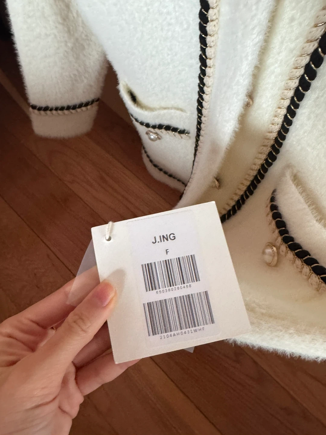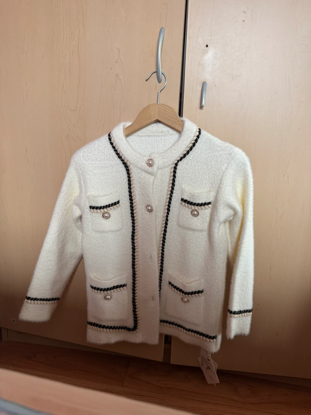 Cream white fuzzy cardigan from J.ING. It features a round neckline, pearl button closures, and decorative pocket details with black and gold trim. Made in a soft, fuzzy material.