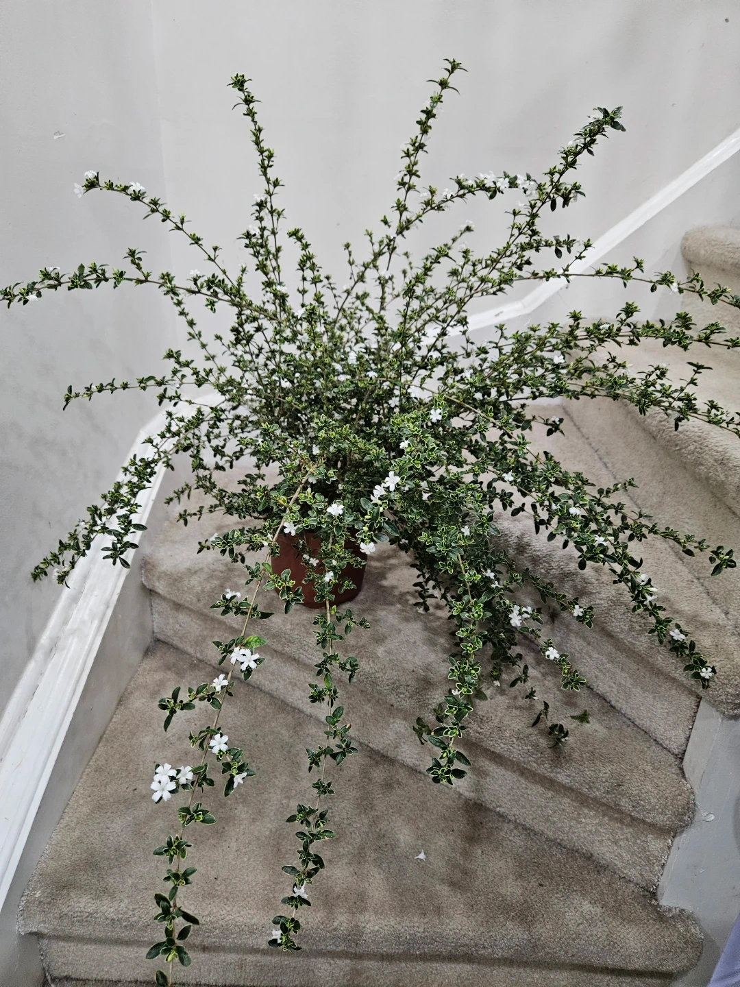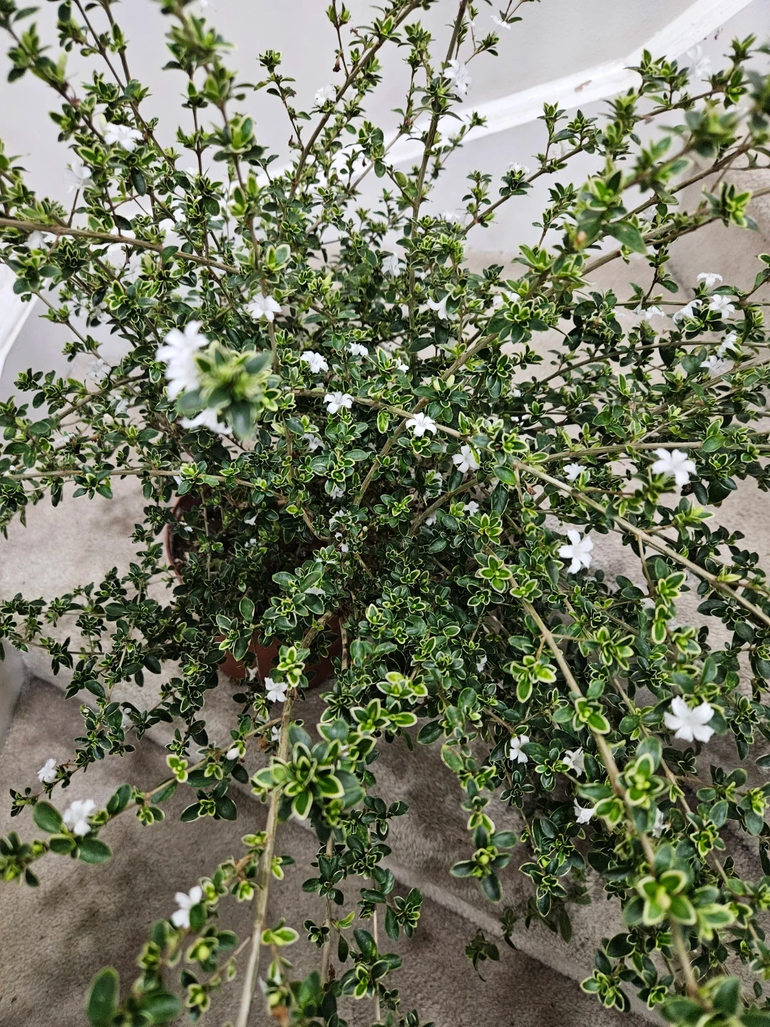 A beautiful serrisa plant with variegated green and white leaves and small white flowers. It's potted and ready for a new home. This plant would liven up any indoor or outdoor space!