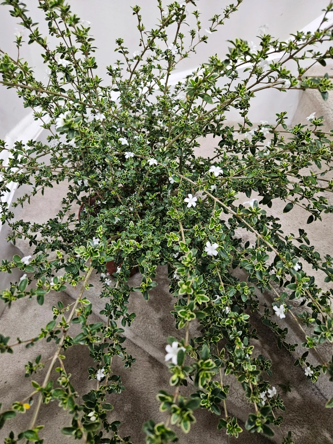 A beautiful serrisa plant with variegated green and white leaves and small white flowers. It's potted and ready for a new home. This plant would liven up any indoor or outdoor space!