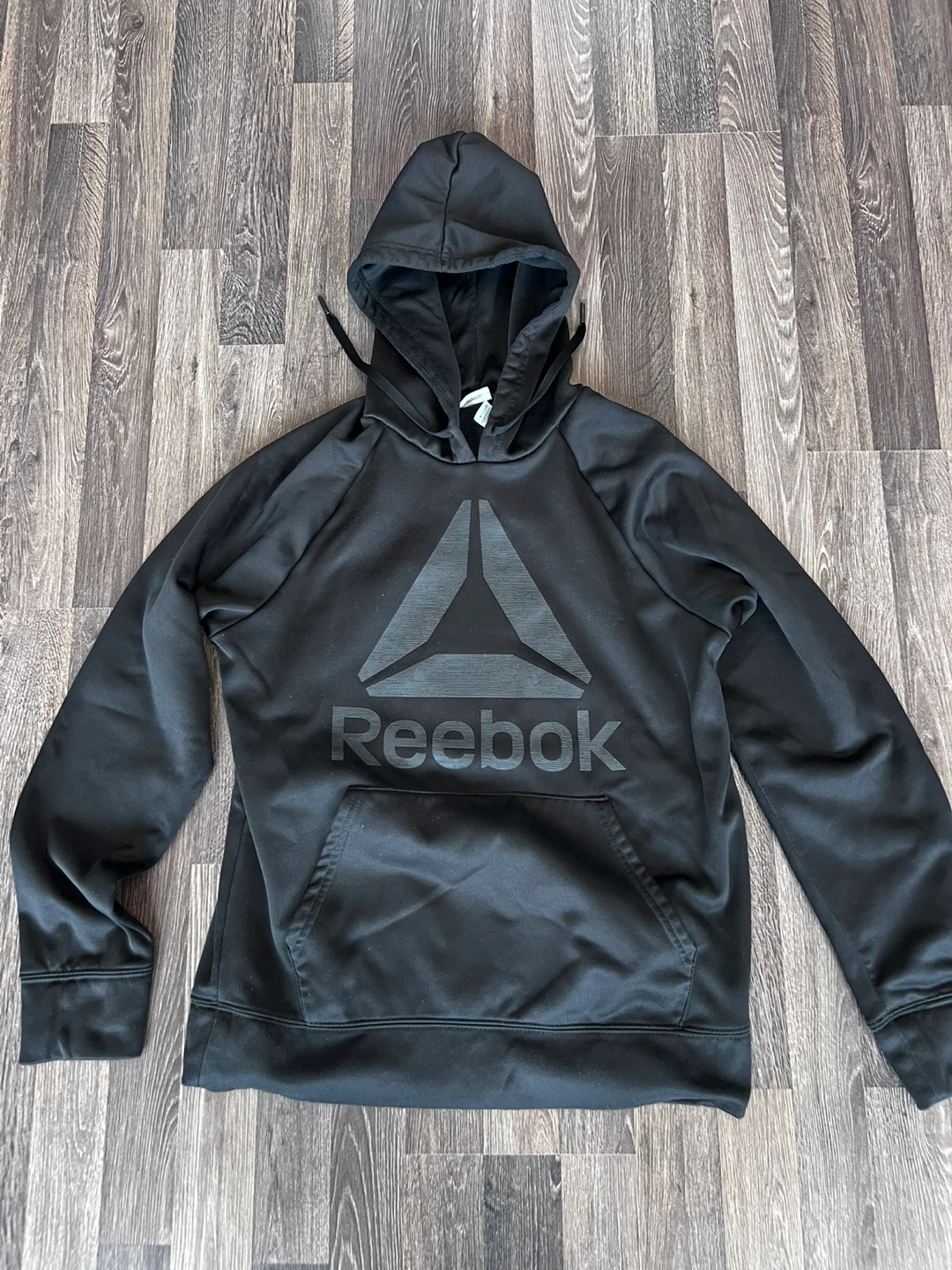 Black Reebok hoodie with the classic Reebok logo printed on the front. It's a pullover style with a front pouch pocket and a drawstring hood. Size is medium.