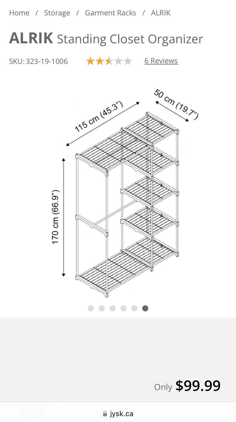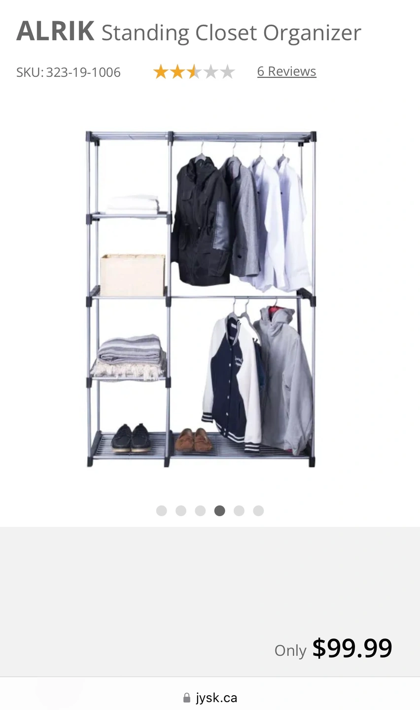 Grey metal standing closet organizer. Multiple shelves and hanging rods. Excellent for organizing clothes and accessories. Great space-saving solution.