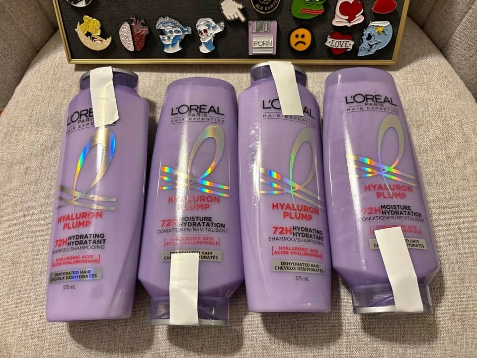 New L'Oréal Paris Hair Expertise Hyaluron Plump shampoo and conditioner set. Includes 2 shampoos and 2 conditioners, each 375 mL. Designed for dehydrated hair, it contains hyaluronic acid for up to 72-hour hydration.